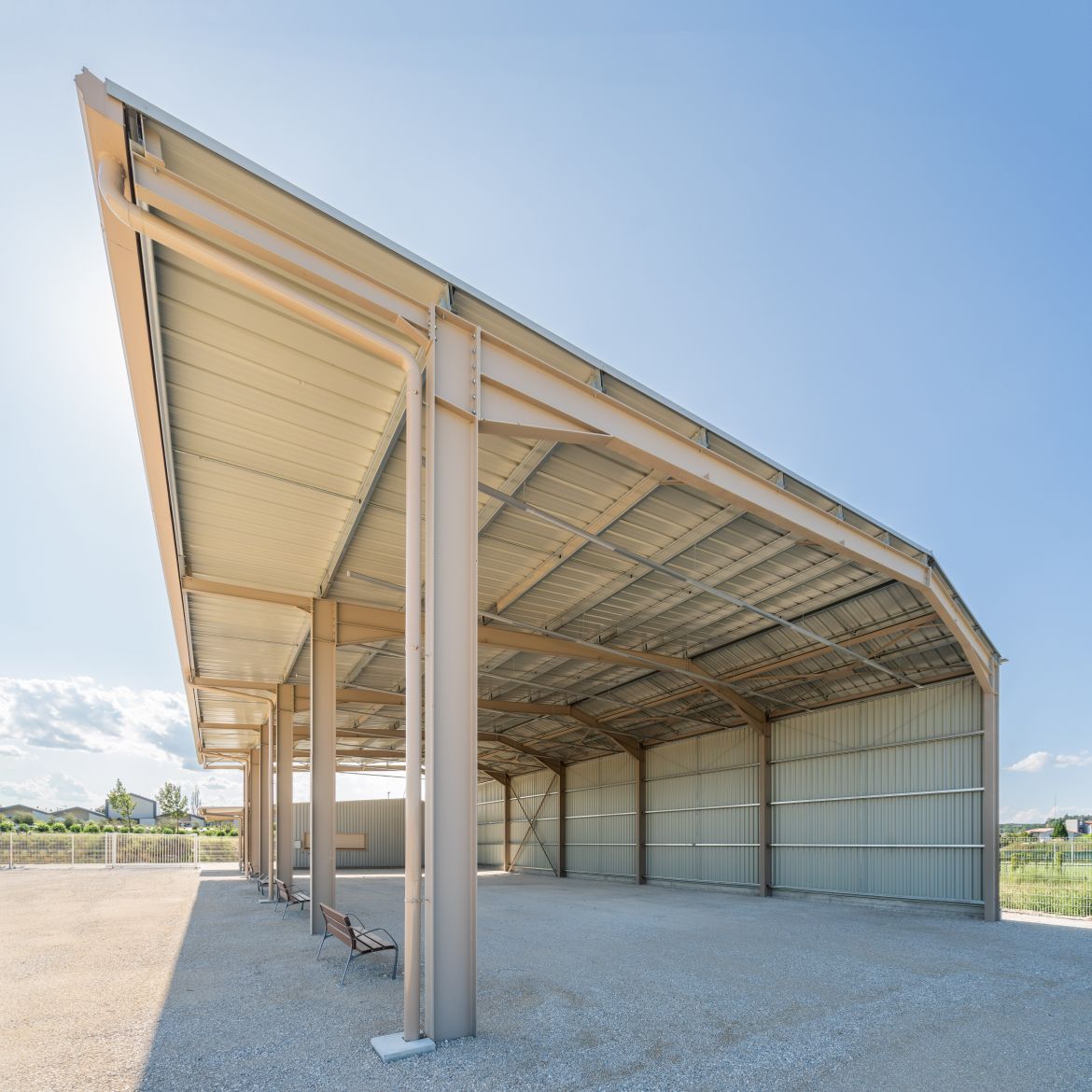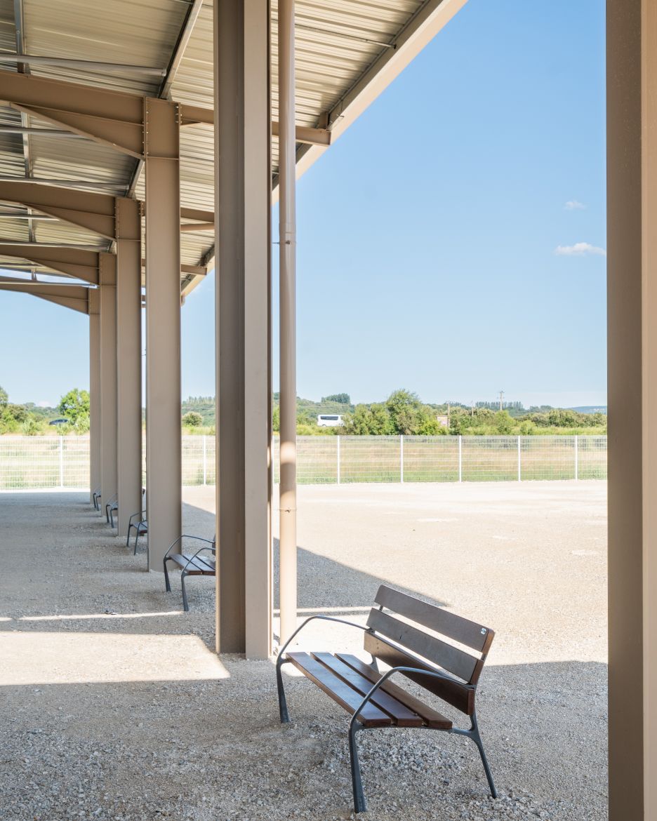 Proche du centre historique de la commune de Donzère, dont plusieurs bâtiments sont inscrits au Patrimoine, la structure du nouveau Boulodrôme se devait d'être légère et se fondre dans l'environnement, tout en préservant les joueurs du Mistral dominant.