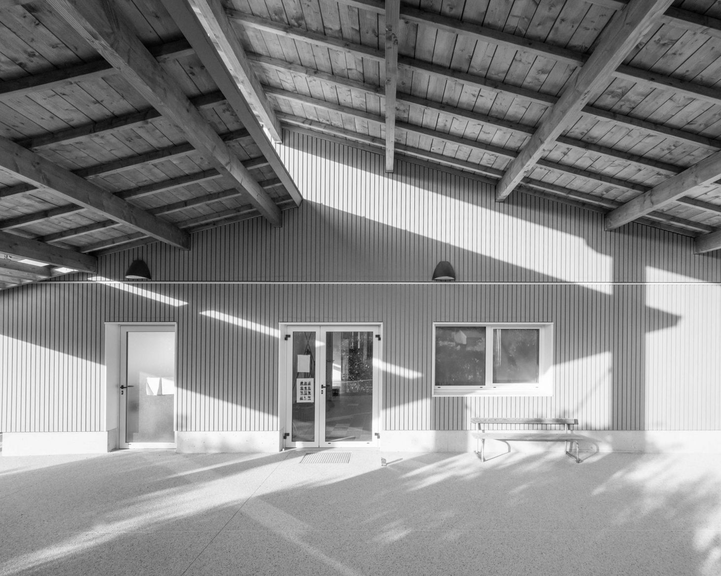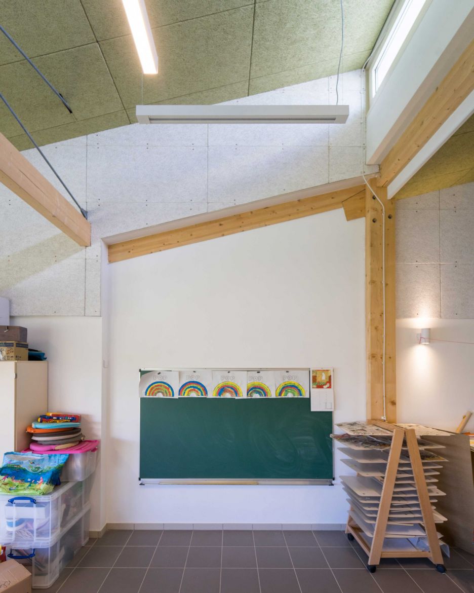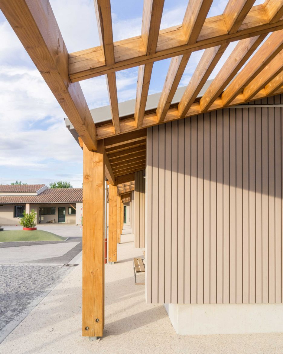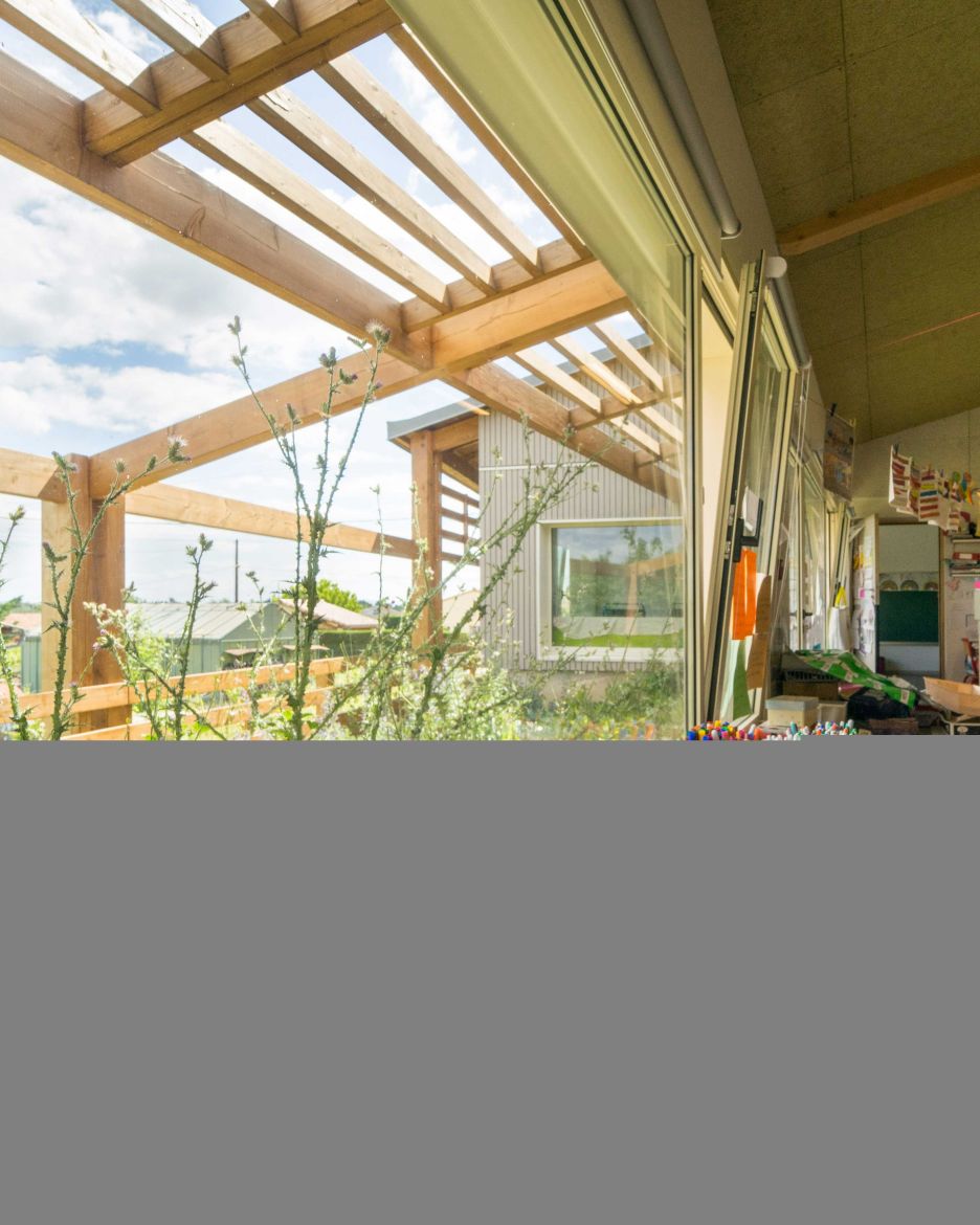 Le projet s’articule autour d’une charpente bois repartie sur trois travées : la première travée reprend la pente de la toiture existante, les deux suivantes sont superposées et permettent ainsi la mise en oeuvre de châssis hauts. Ceux-ci apportent une lumière douce et constante aux espaces de circulations et aux classes et libèrent de la hauteur en fond de salle. Les fonctions se composent naturellement à l’aide de la trame : chaque espace est inscrit dans une ou plusieurs trames.