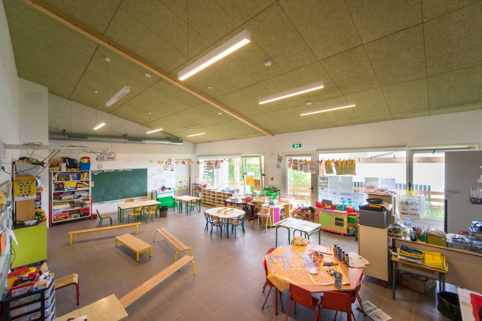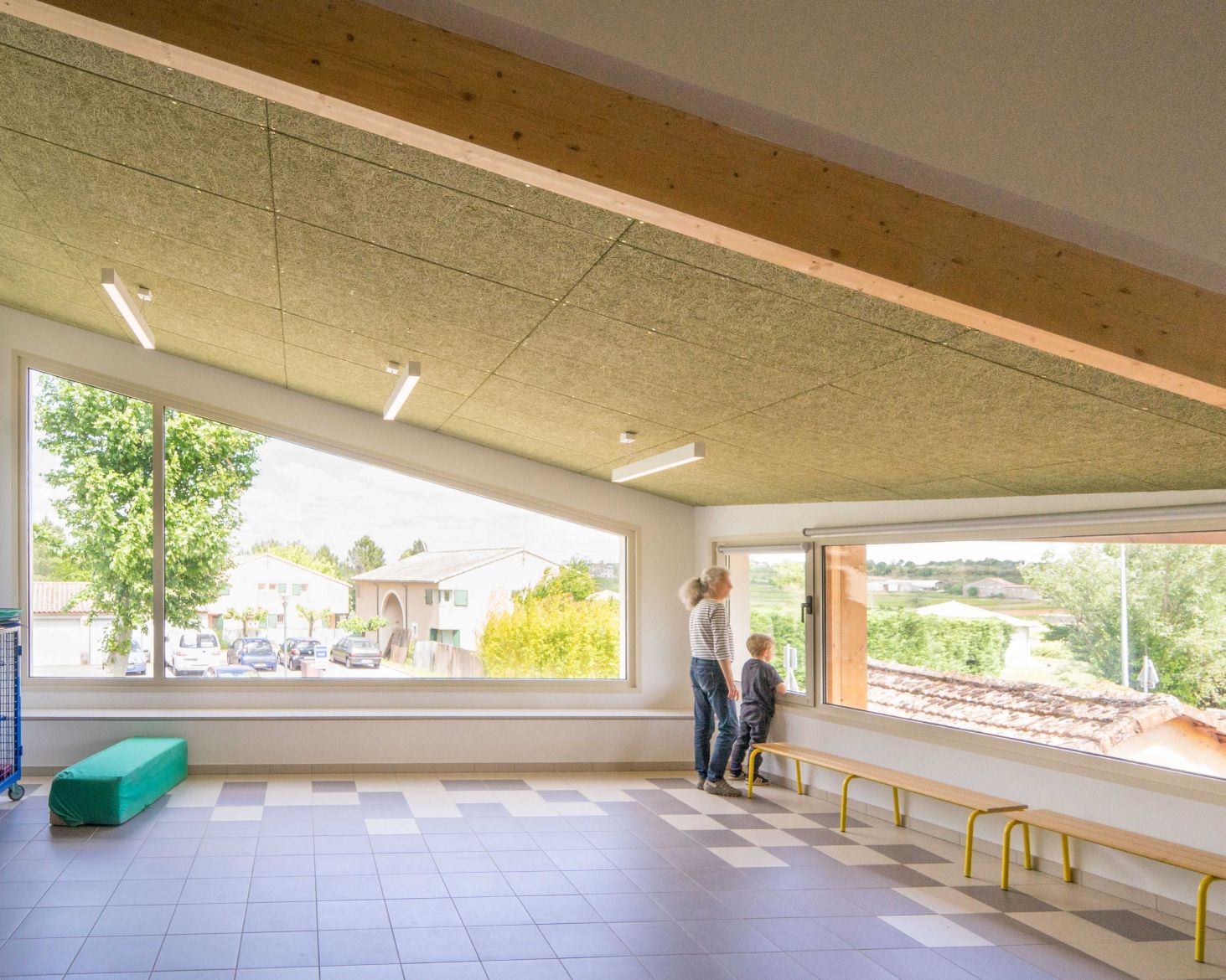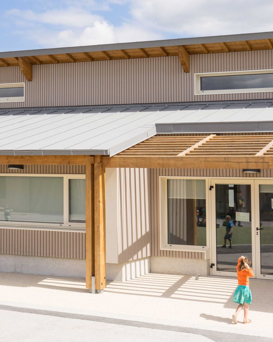 Le projet s’articule autour d’une charpente bois repartie sur trois travées : la première travée reprend la pente de la toiture existante, les deux suivantes sont superposées et permettent ainsi la mise en oeuvre de châssis hauts. Ceux-ci apportent une lumière douce et constante aux espaces de circulations et aux classes et libèrent de la hauteur en fond de salle. Les fonctions se composent naturellement à l’aide de la trame : chaque espace est inscrit dans une ou plusieurs trames.