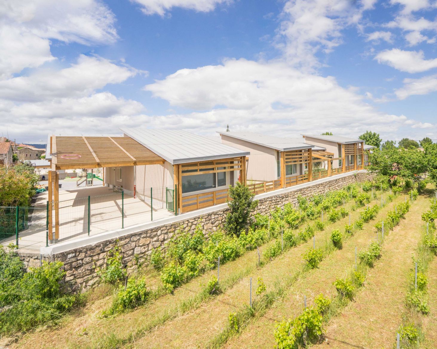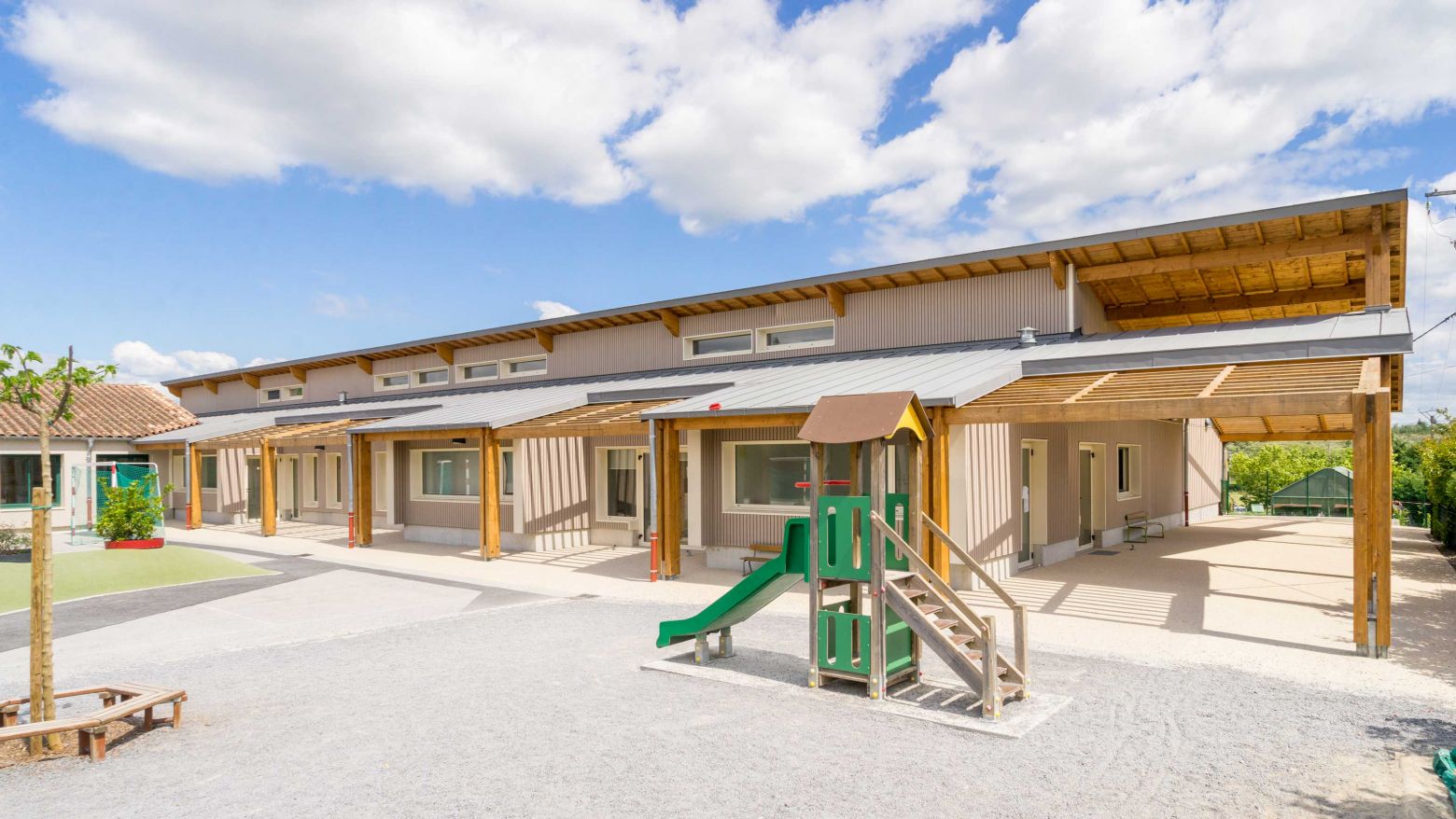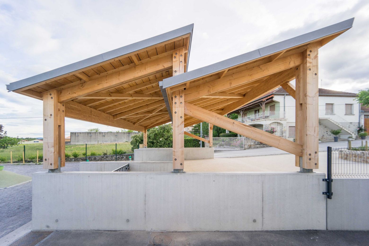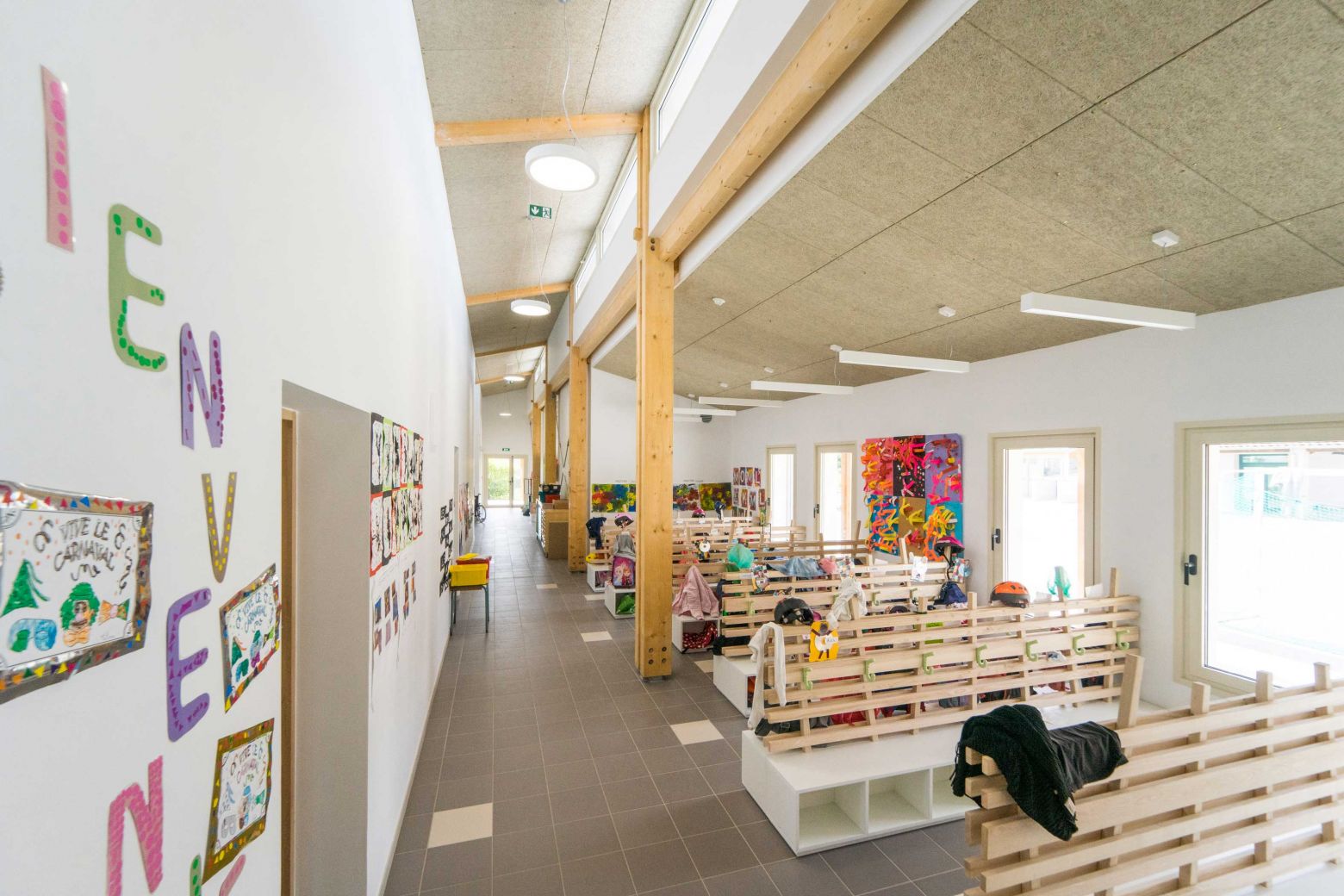 Le projet s’articule autour d’une charpente bois repartie sur trois travées : la première travée reprend la pente de la toiture existante, les deux suivantes sont superposées et permettent ainsi la mise en oeuvre de châssis hauts. Ceux-ci apportent une lumière douce et constante aux espaces de circulations et aux classes et libèrent de la hauteur en fond de salle. Les fonctions se composent naturellement à l’aide de la trame : chaque espace est inscrit dans une ou plusieurs trames.