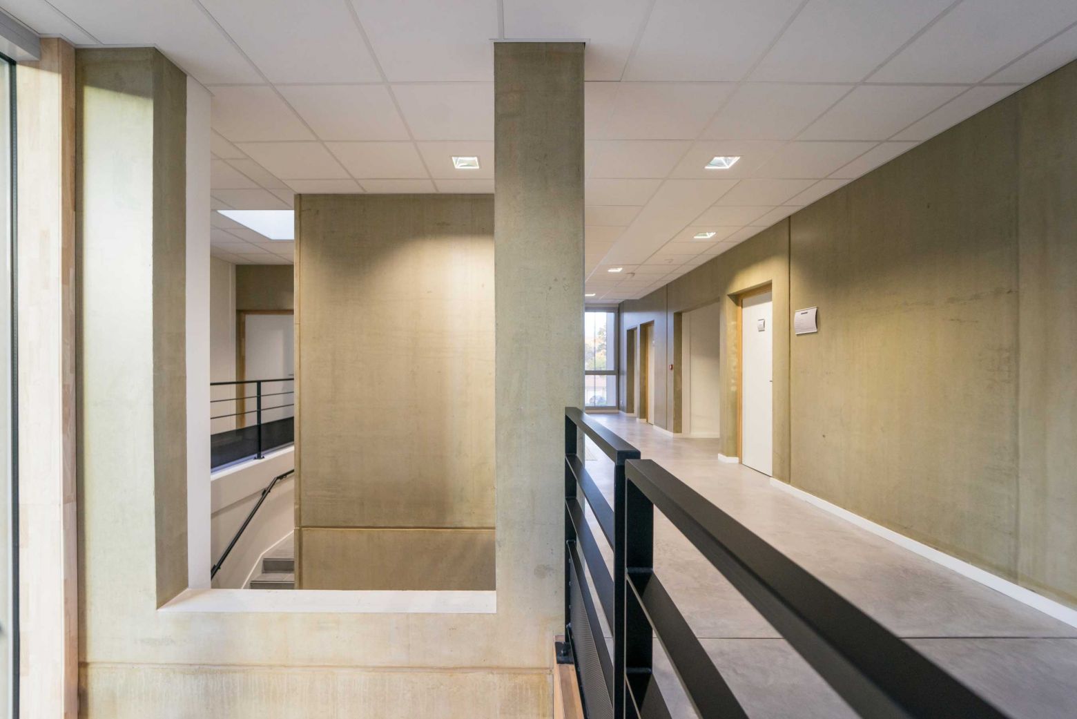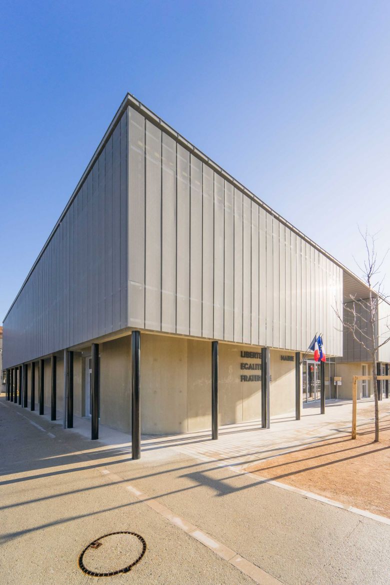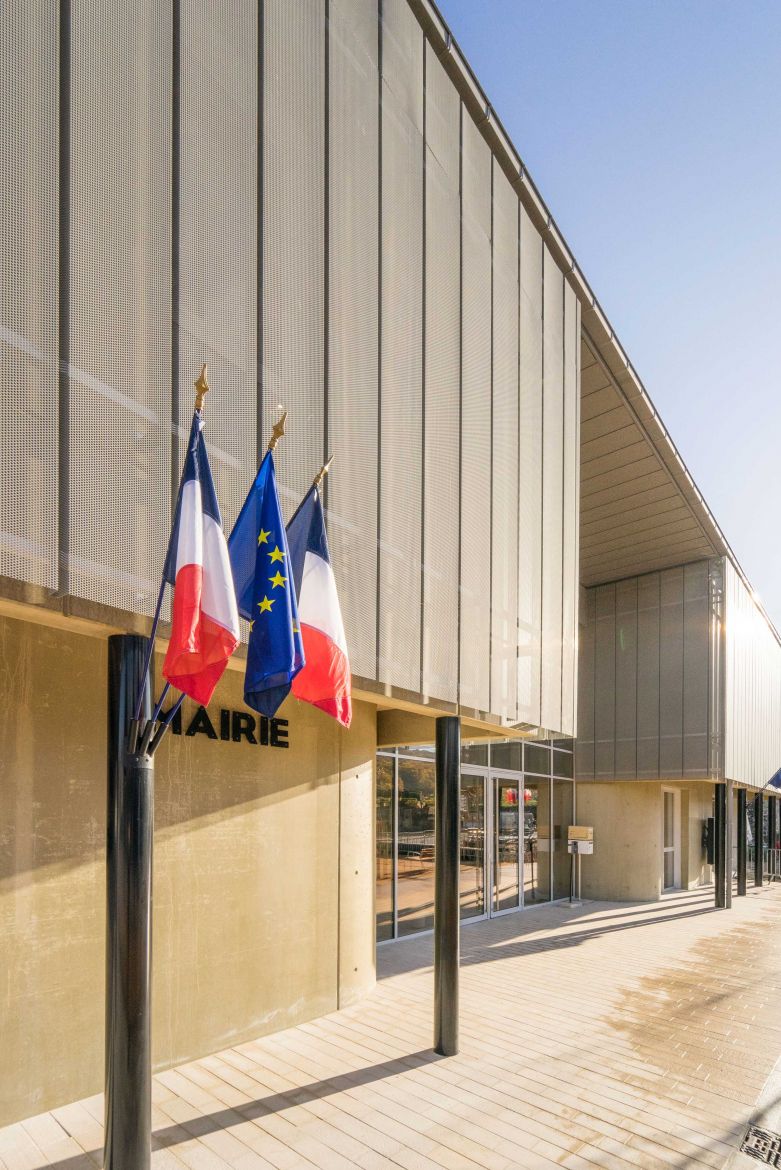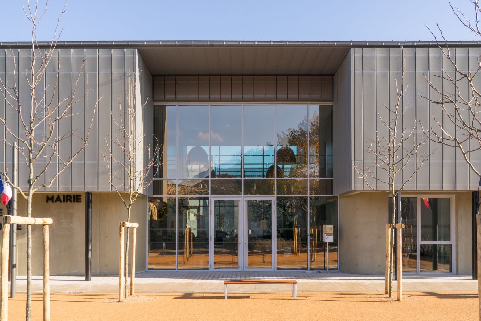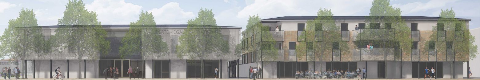 Les points d’appuis sont les pignons dégagés par les démolitions de la mairie annexe et de la maison contiguë. Le bâtiment se développe sur 2 niveaux en forme de « L »: RDC : salle d’activités et salle d’informatique en relation visuelle avec l’école (Nord-Est), salle du conseil ainsi que les bureaux d’accueil et CCAS (Sud-Est) ouverts sur la place créée en partie Ouest réunis au centre par le hall d’accueil traversant (Ouest-Est). R+1 les archives, locaux techniques et la salle de réunion sont positionnés au dessus de la première partie Nord-Est, les bureaux au-dessus da la salle du Conseil reliés par une passerelle au-dessus du hall d’accueil. En positon Centrale un patio est aménagé entre les pignons existants et la future mairie. Cet espace offrira au bâtiment luminosité du Sud ainsi qu’une surface intimiste.