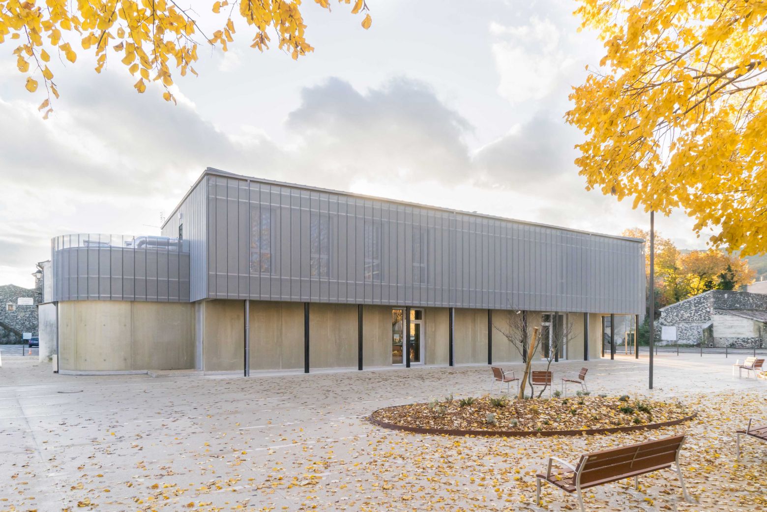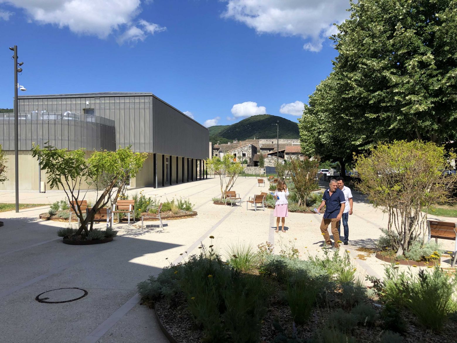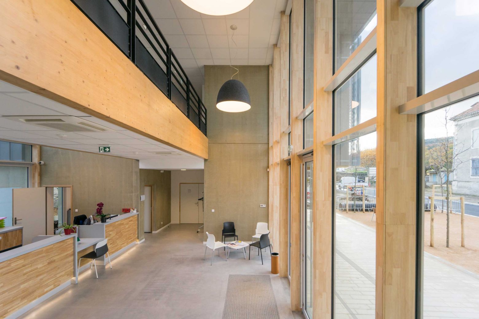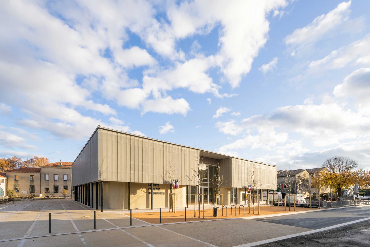 Les points d’appuis sont les pignons dégagés par les démolitions de la mairie annexe et de la maison contiguë. Le bâtiment se développe sur 2 niveaux en forme de « L »: RDC : salle d’activités et salle d’informatique en relation visuelle avec l’école (Nord-Est), salle du conseil ainsi que les bureaux d’accueil et CCAS (Sud-Est) ouverts sur la place créée en partie Ouest réunis au centre par le hall d’accueil traversant (Ouest-Est). R+1 les archives, locaux techniques et la salle de réunion sont positionnés au dessus de la première partie Nord-Est, les bureaux au-dessus da la salle du Conseil reliés par une passerelle au-dessus du hall d’accueil. En positon Centrale un patio est aménagé entre les pignons existants et la future mairie. Cet espace offrira au bâtiment luminosité du Sud ainsi qu’une surface intimiste.