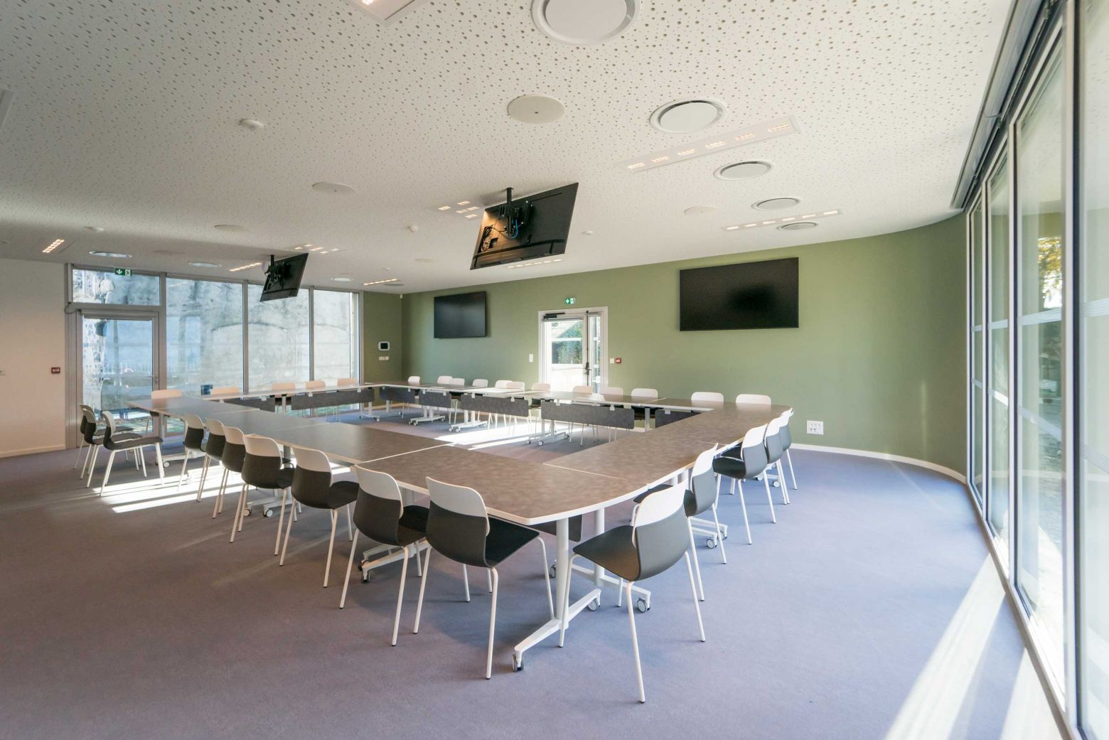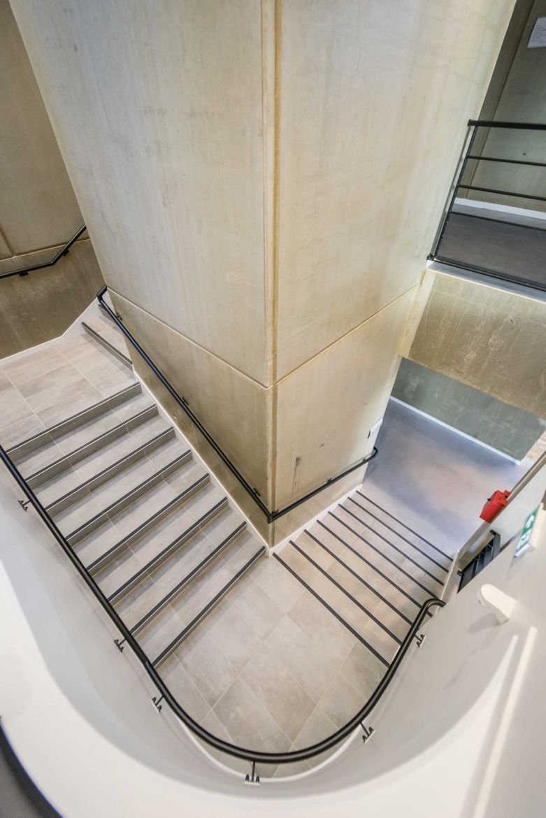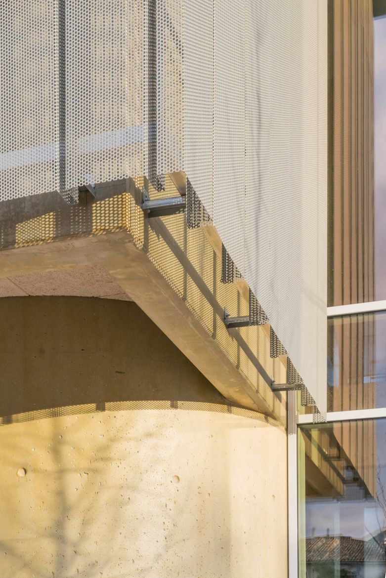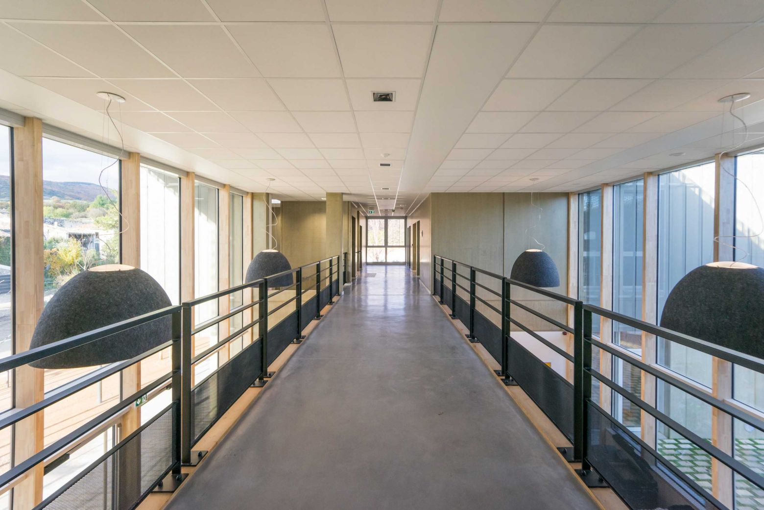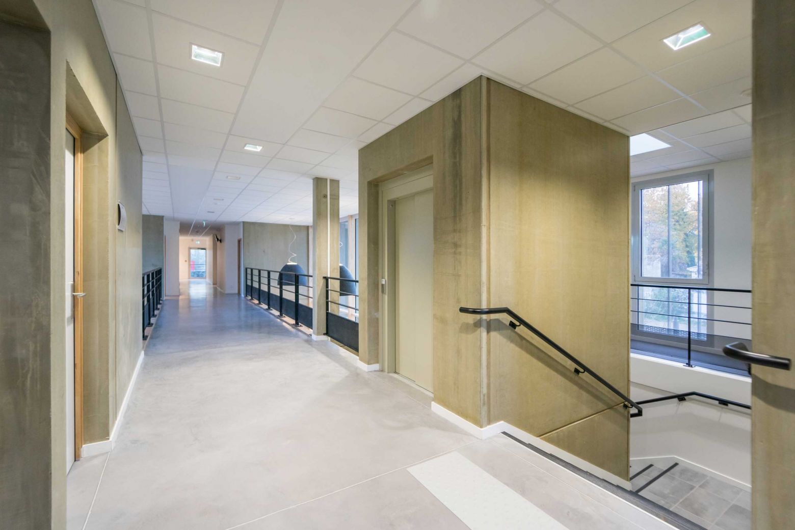 Les points d’appuis sont les pignons dégagés par les démolitions de la mairie annexe et de la maison contiguë. Le bâtiment se développe sur 2 niveaux en forme de « L »: RDC : salle d’activités et salle d’informatique en relation visuelle avec l’école (Nord-Est), salle du conseil ainsi que les bureaux d’accueil et CCAS (Sud-Est) ouverts sur la place créée en partie Ouest réunis au centre par le hall d’accueil traversant (Ouest-Est). R+1 les archives, locaux techniques et la salle de réunion sont positionnés au dessus de la première partie Nord-Est, les bureaux au-dessus da la salle du Conseil reliés par une passerelle au-dessus du hall d’accueil. En positon Centrale un patio est aménagé entre les pignons existants et la future mairie. Cet espace offrira au bâtiment luminosité du Sud ainsi qu’une surface intimiste.