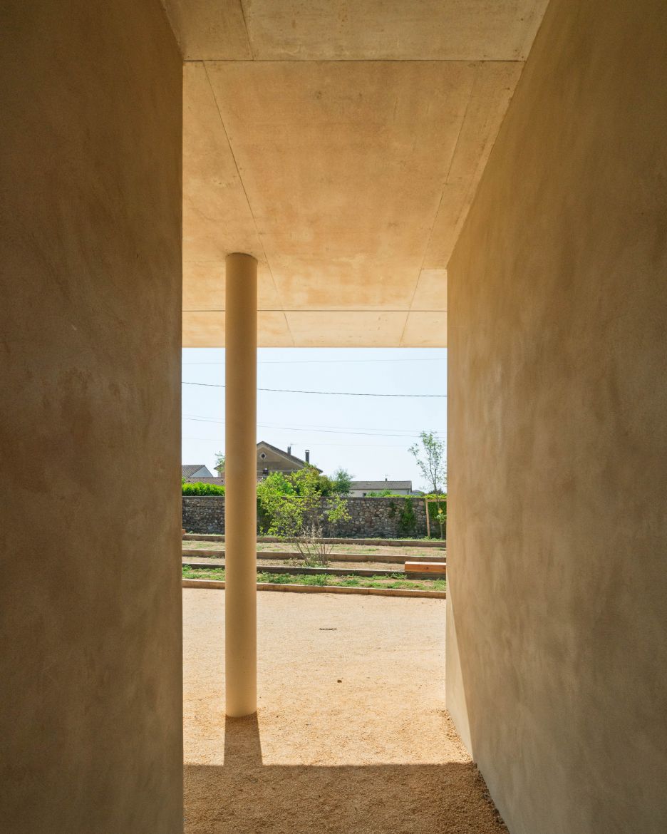 La dalle brute de la toiture, laissée apparente en sous-face, dialogue avec la rugosité de la pierre de Ruoms. Ce choix exprime une matérialité assumée, où la douceur du béton lisse côtoie la texture brute, dans un jeu de contrastes maîtrisé.
