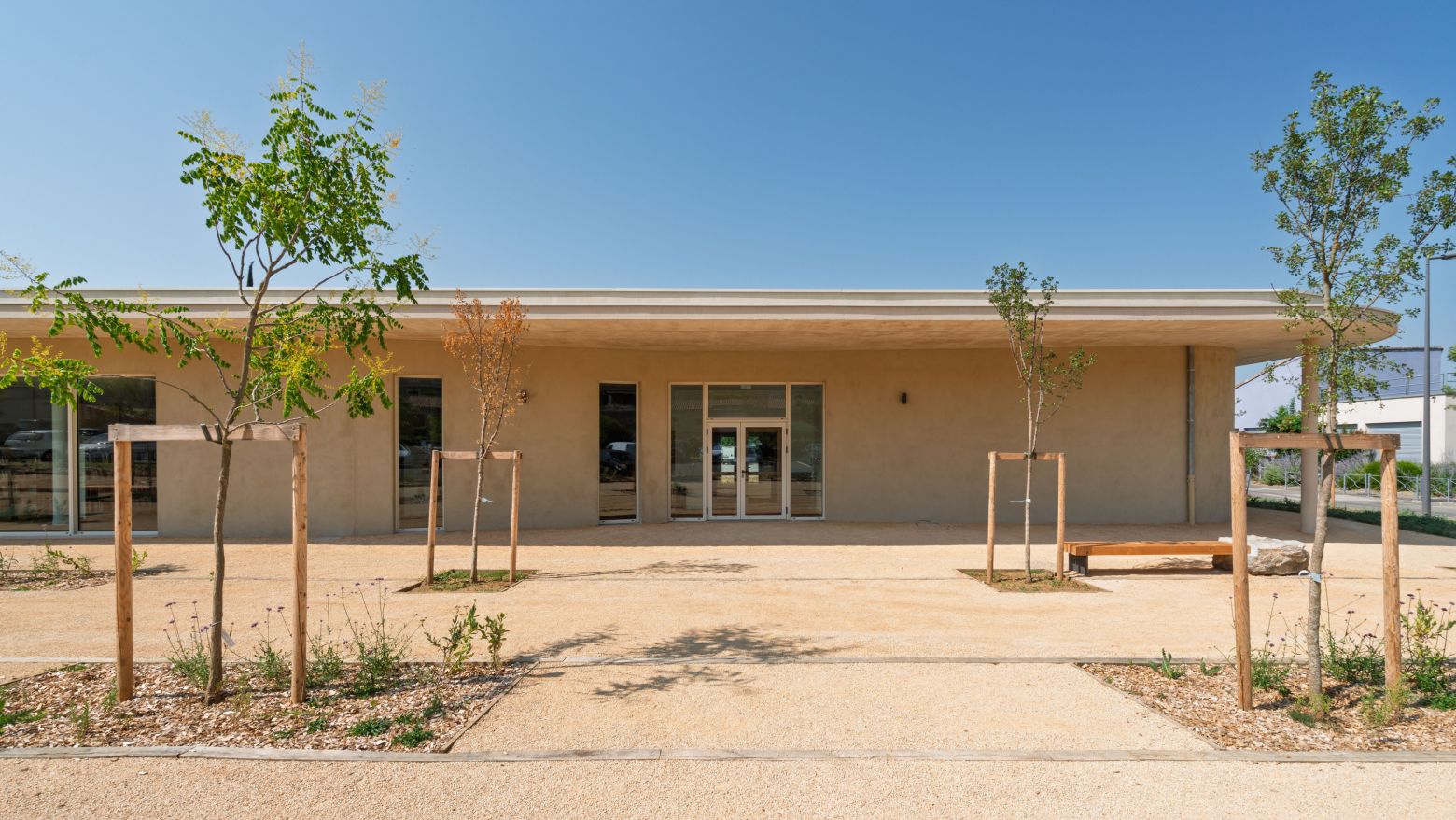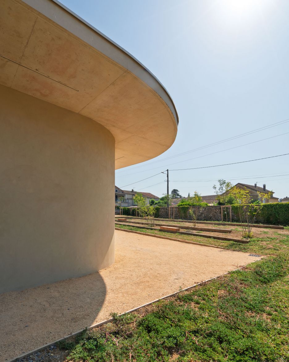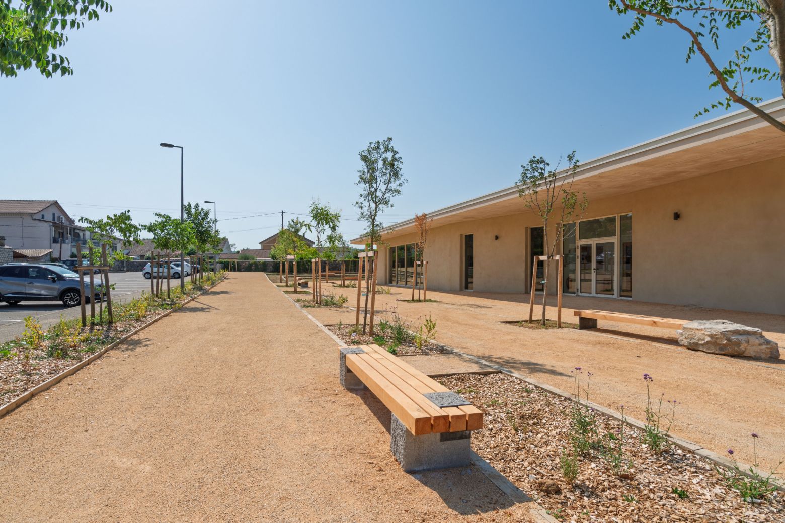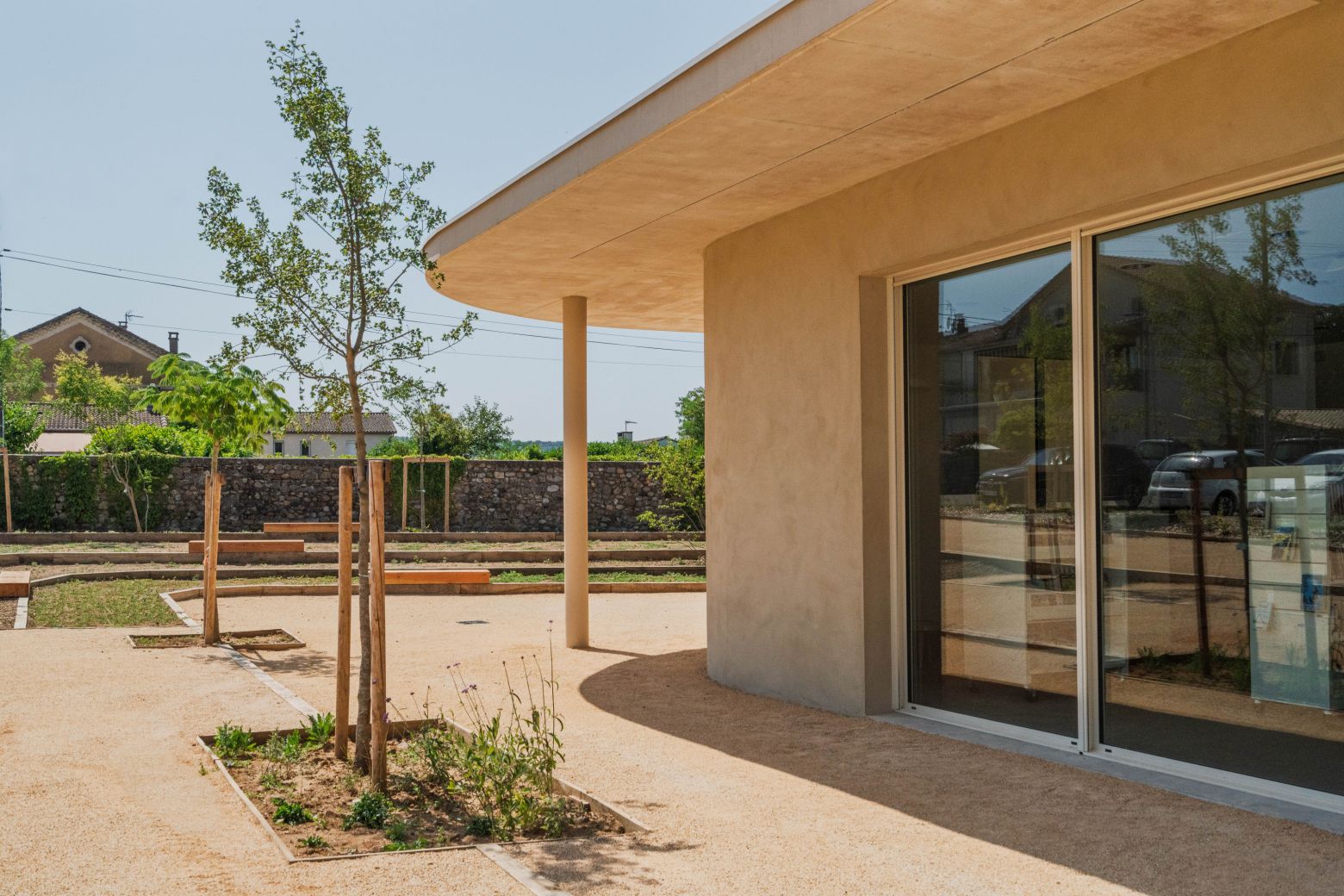 Les aménagements extérieurs ont été pensés comme une extension naturelle du bâtiment. Leur tracé souligne la silhouette courbe du projet et accompagne le visiteur dans une déambulation douce. Un jardin de lecture offre un espace calme et végétalisé, propice à la contemplation. À terme, les arbres apporteront ombre et fraîcheur, renforçant le confort des usagers en période estivale.