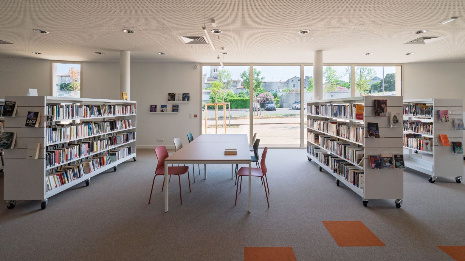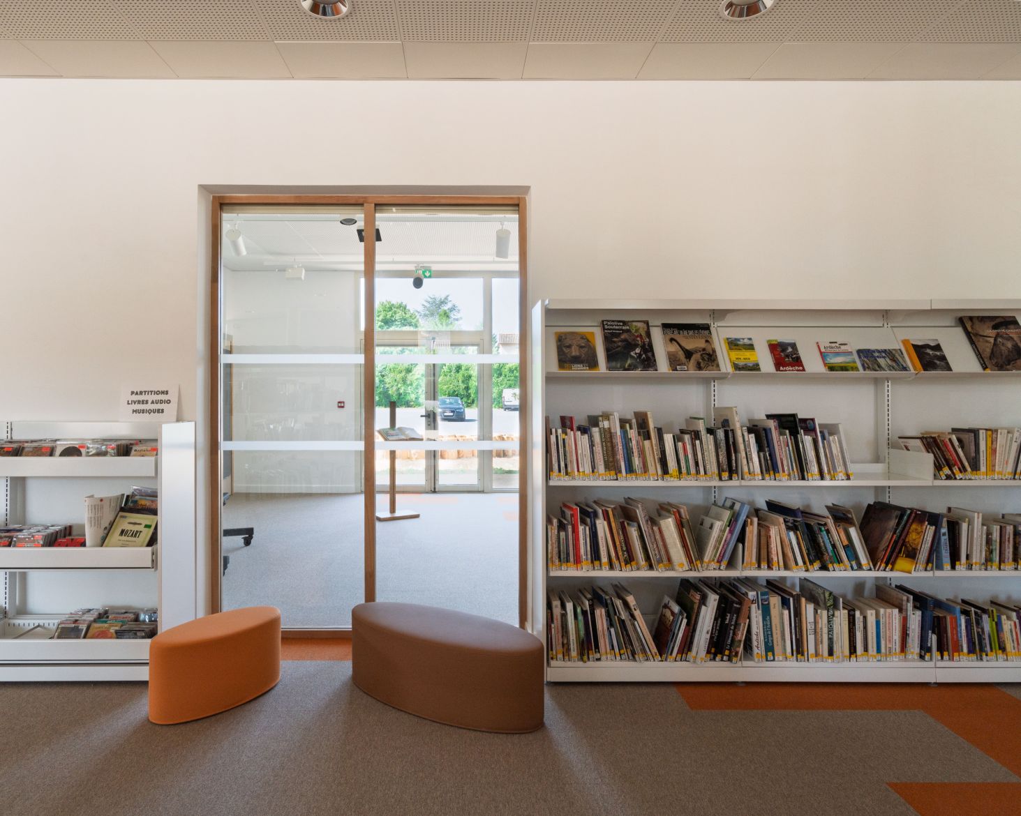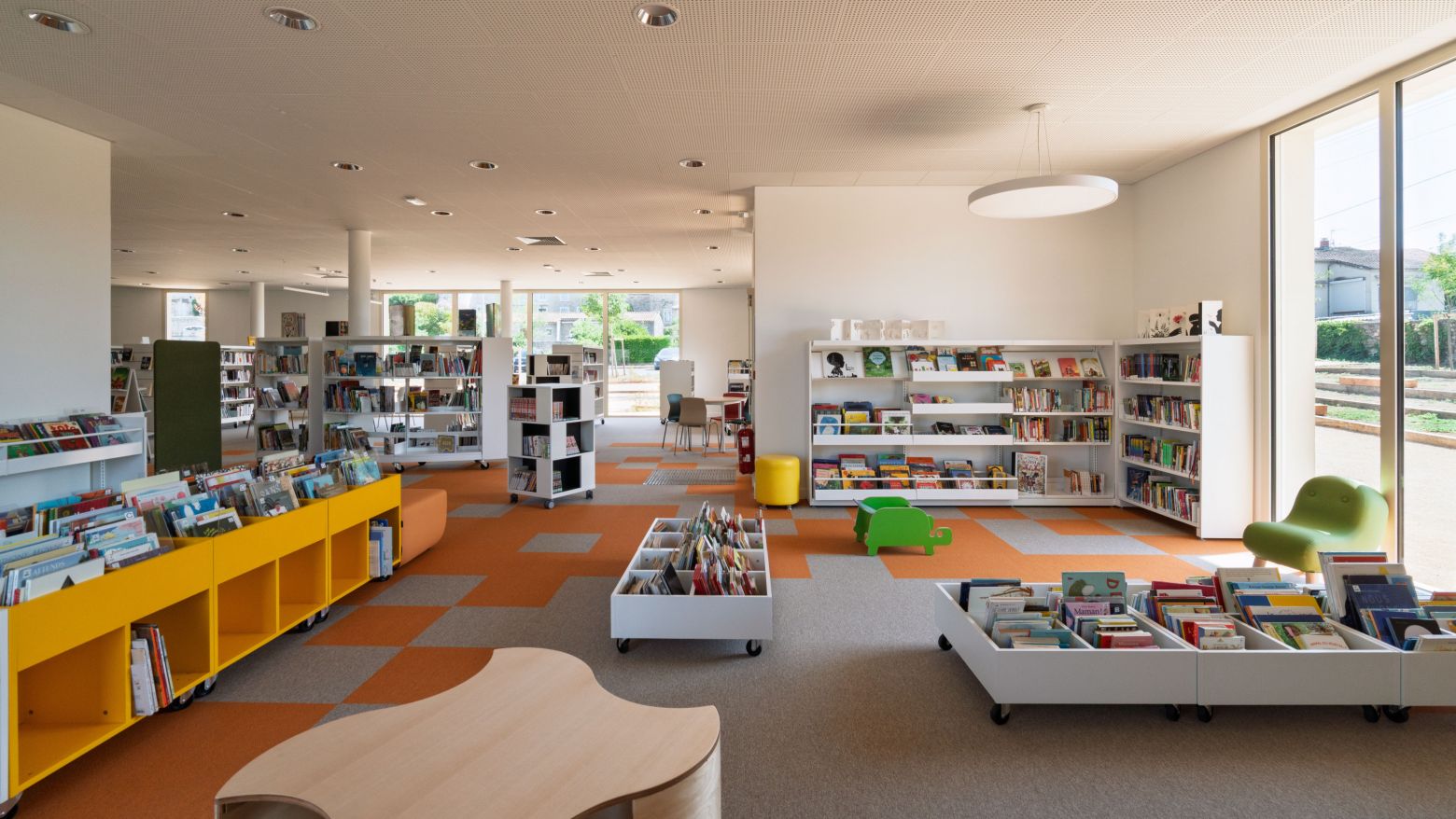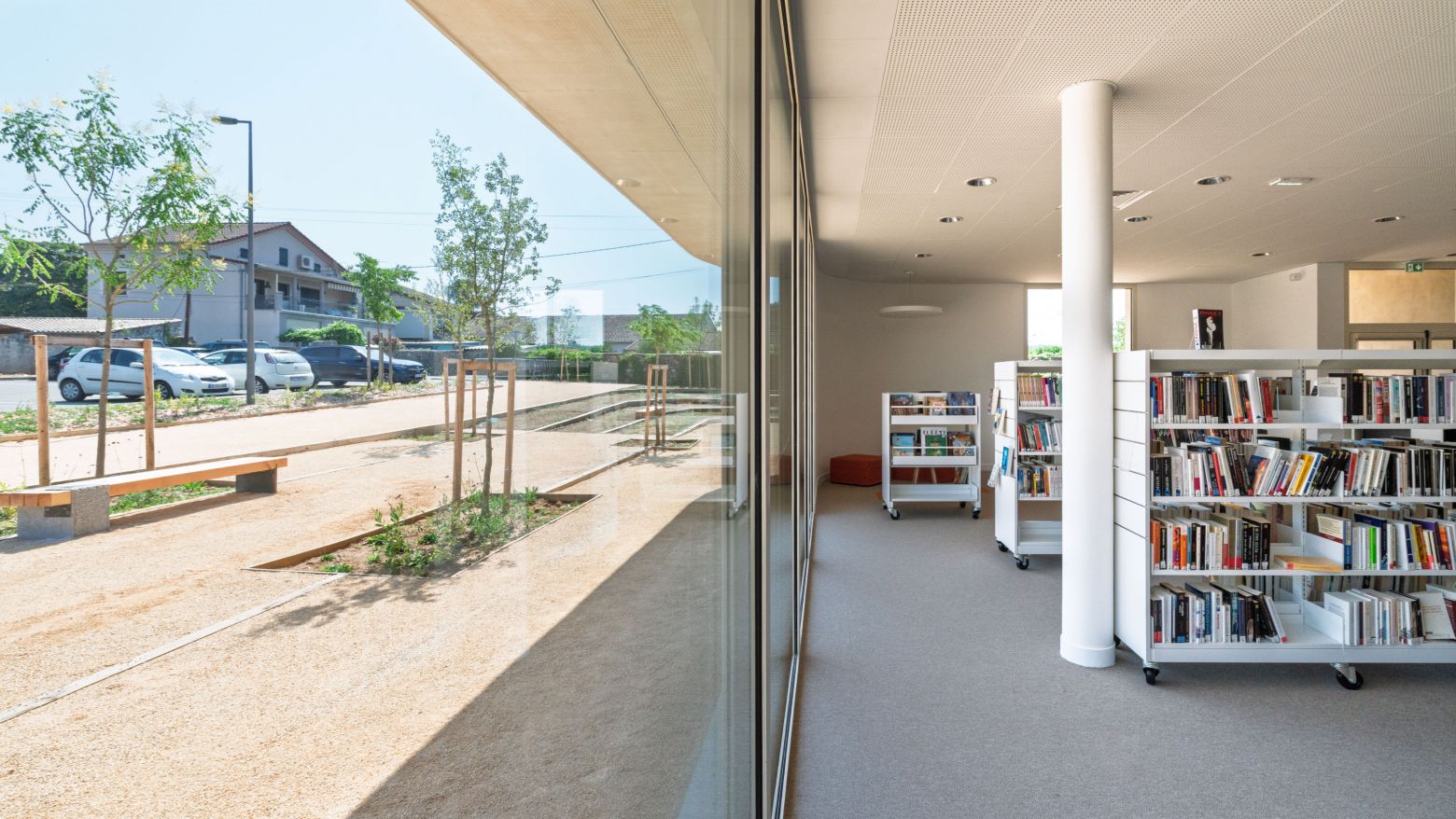 Le site accueille également des jeux pour enfants, des assises et des espaces de promenade, favorisant les usages intergénérationnels et la convivialité. Ce paysage actif et sensible complète l’expérience architecturale et renforce l’ancrage de la médiathèque dans son territoire.