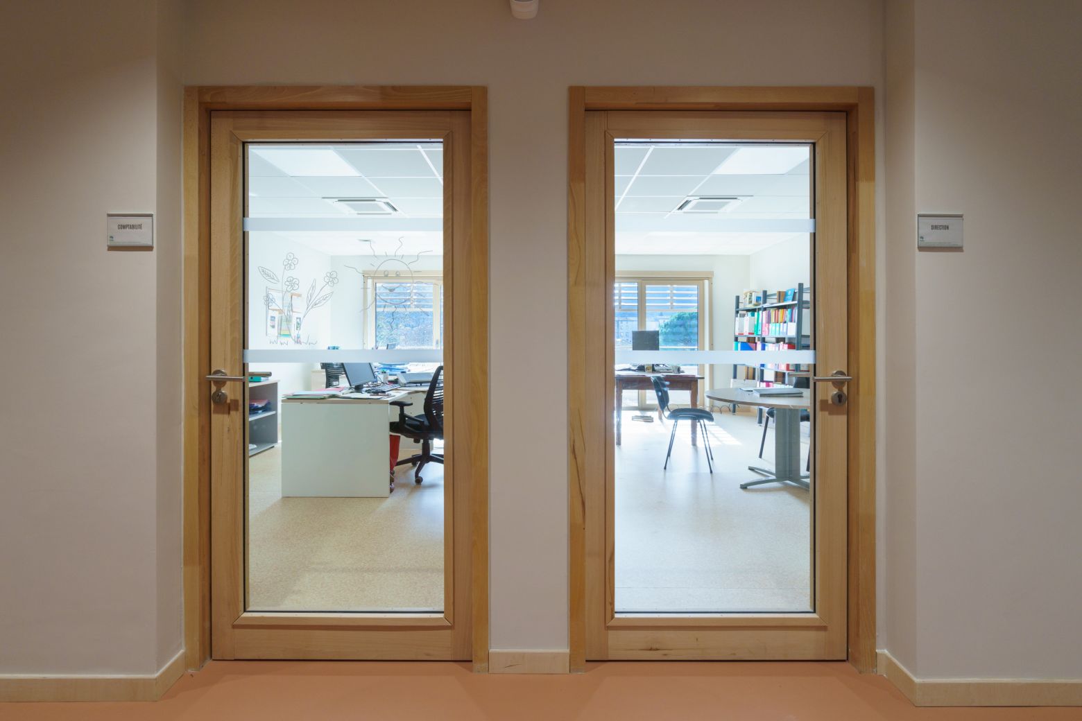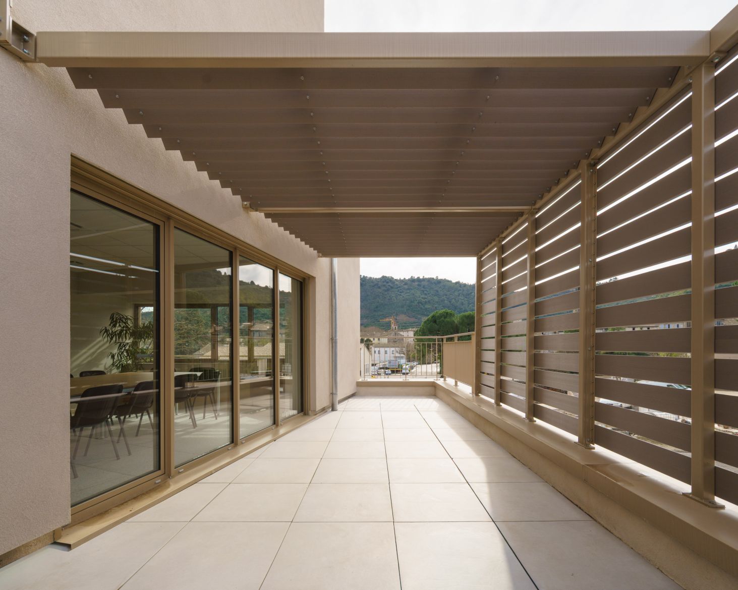 Pensé pour le confort des usagers comme des agents, le projet mutualise les espaces de travail, de rencontre et de détente tout en s’appuyant sur des choix techniques ambitieux : isolation thermique par l’extérieur en laine de roche, enduits à la chaux, ouate de cellulose en combles, menuiseries bois, pompe à chaleur, ventilation double flux, brises-soleil en façade étudiés selon l’inclinaison des rayons UV pour chaque saisons et gestion technique intelligente du bâtiment. La réfection des étanchéités et l’installation de panneaux photovoltaïques viennent compléter un dispositif à haute performance énergétique. Labellisé par le Fonds Vert, ce projet permet une réduction de 60 % des consommations et des émissions de gaz à effet de serre.