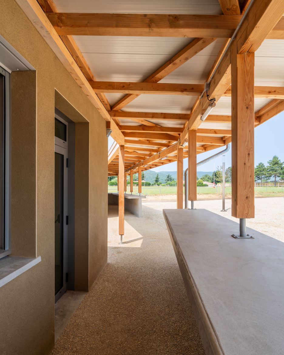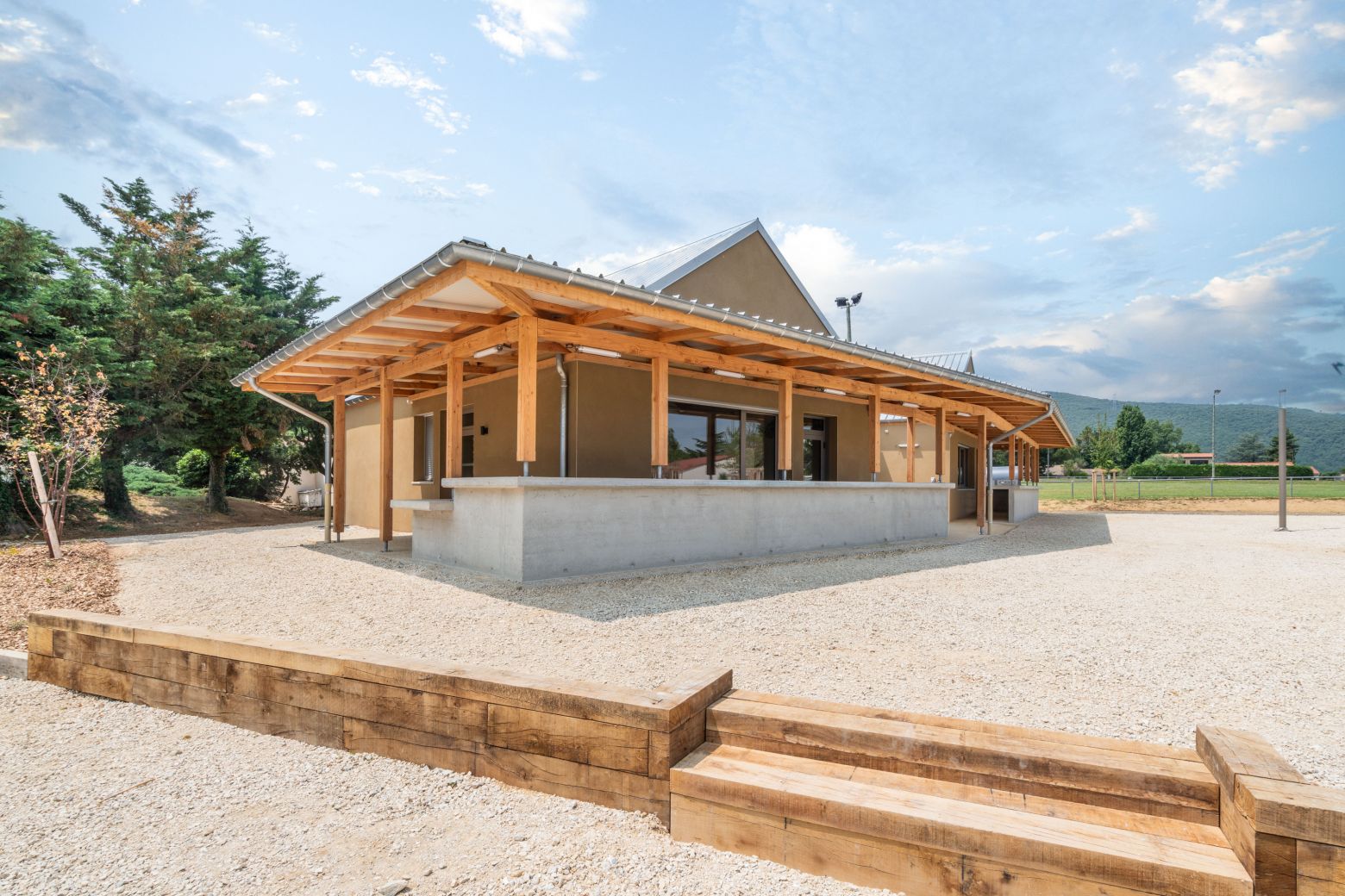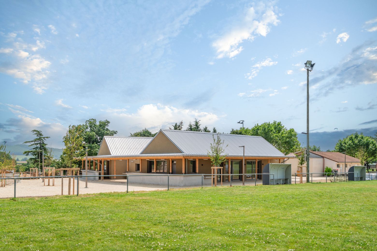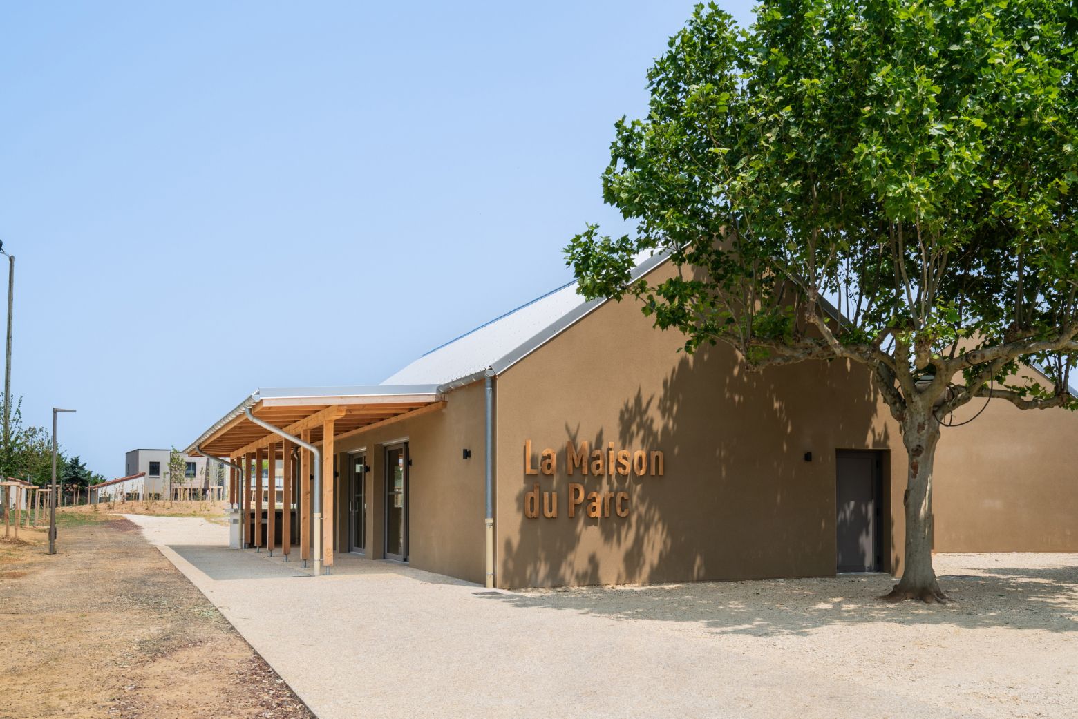 La Maison du Parc prend place au centre du nouveau Parc de Toulaud, aménagé dans la plaine, au pied du village. Ce positionnement stratégique en fait un véritable repère, à la croisée des chemins entre nature, vie locale et activités partagées. Elle s’impose comme un trait d’union entre les pratiques sportives, les espaces ludiques et les dynamiques associatives, incarnant l’esprit du lieu : ouvert, inclusif et tourné vers le vivre-ensemble.