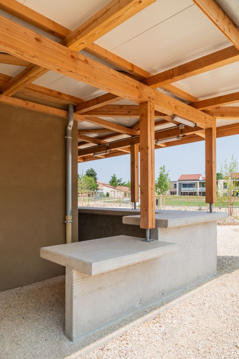 Composée de deux volumes aux formes familières, elle s’ouvre telle un compas dans un écrin végétal, en parfaite harmonie avec son environnement naturel. Un large auvent à la charpente bois, à la fois élégant et fonctionnel, souligne les lignes architecturales et abrite un bar généreux de 30 mètres linéaires, invitant à la détente et à la rencontre.