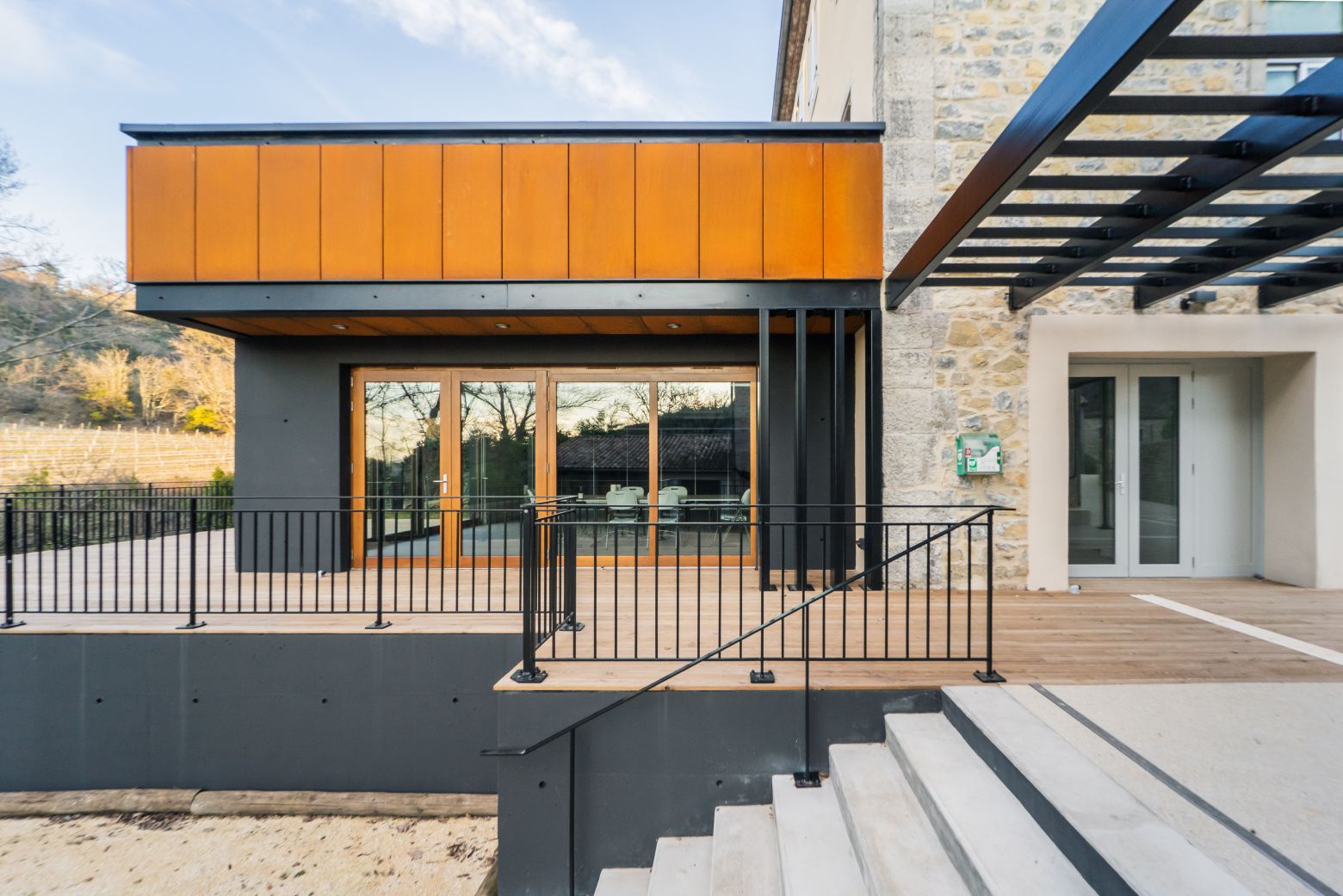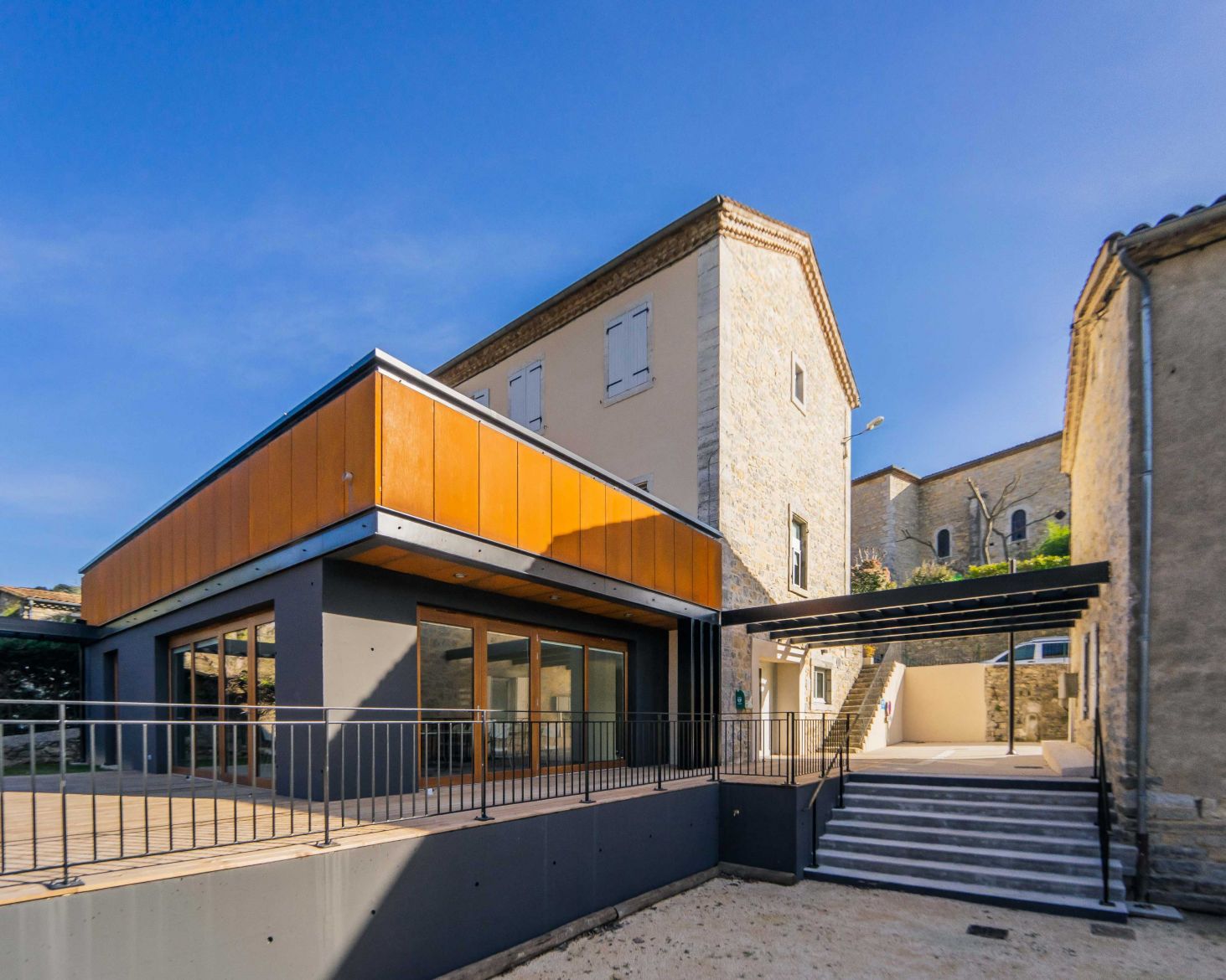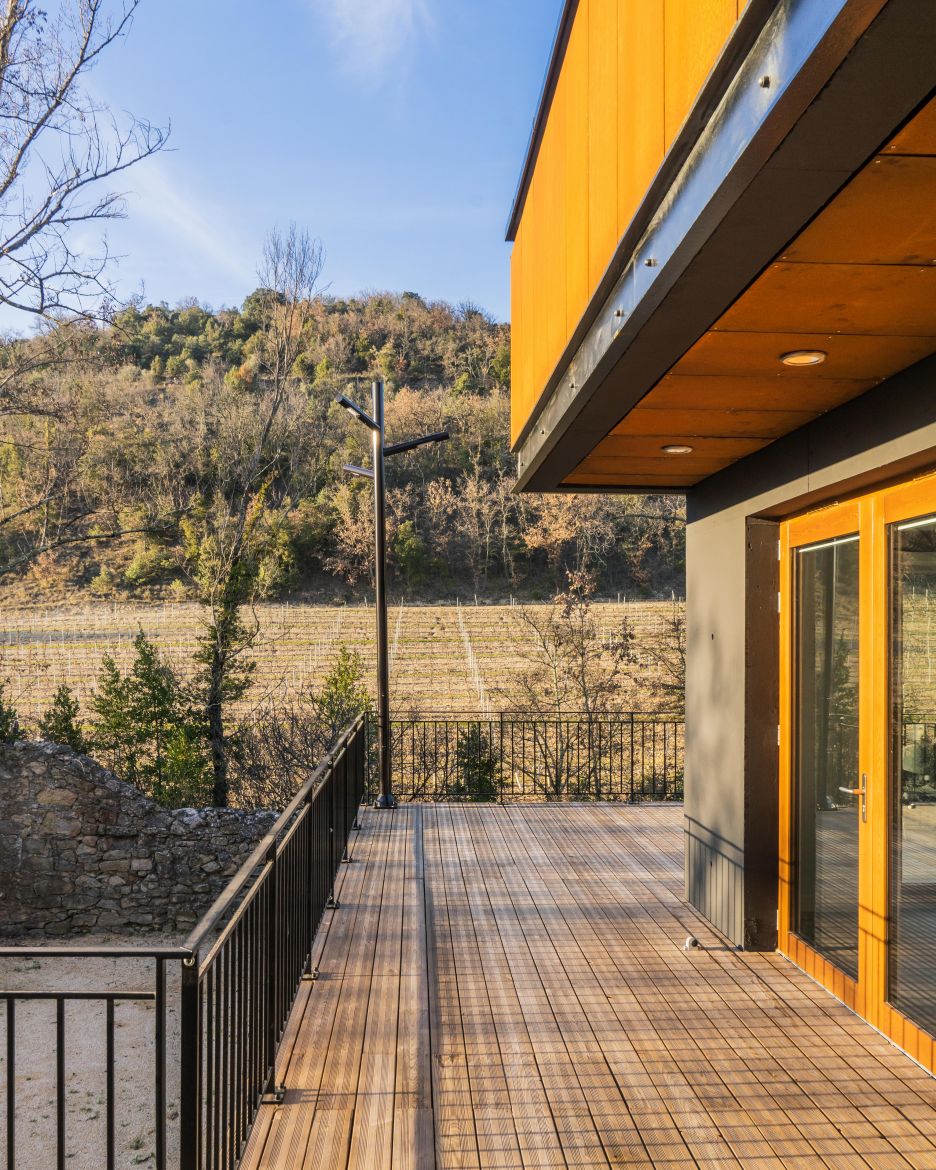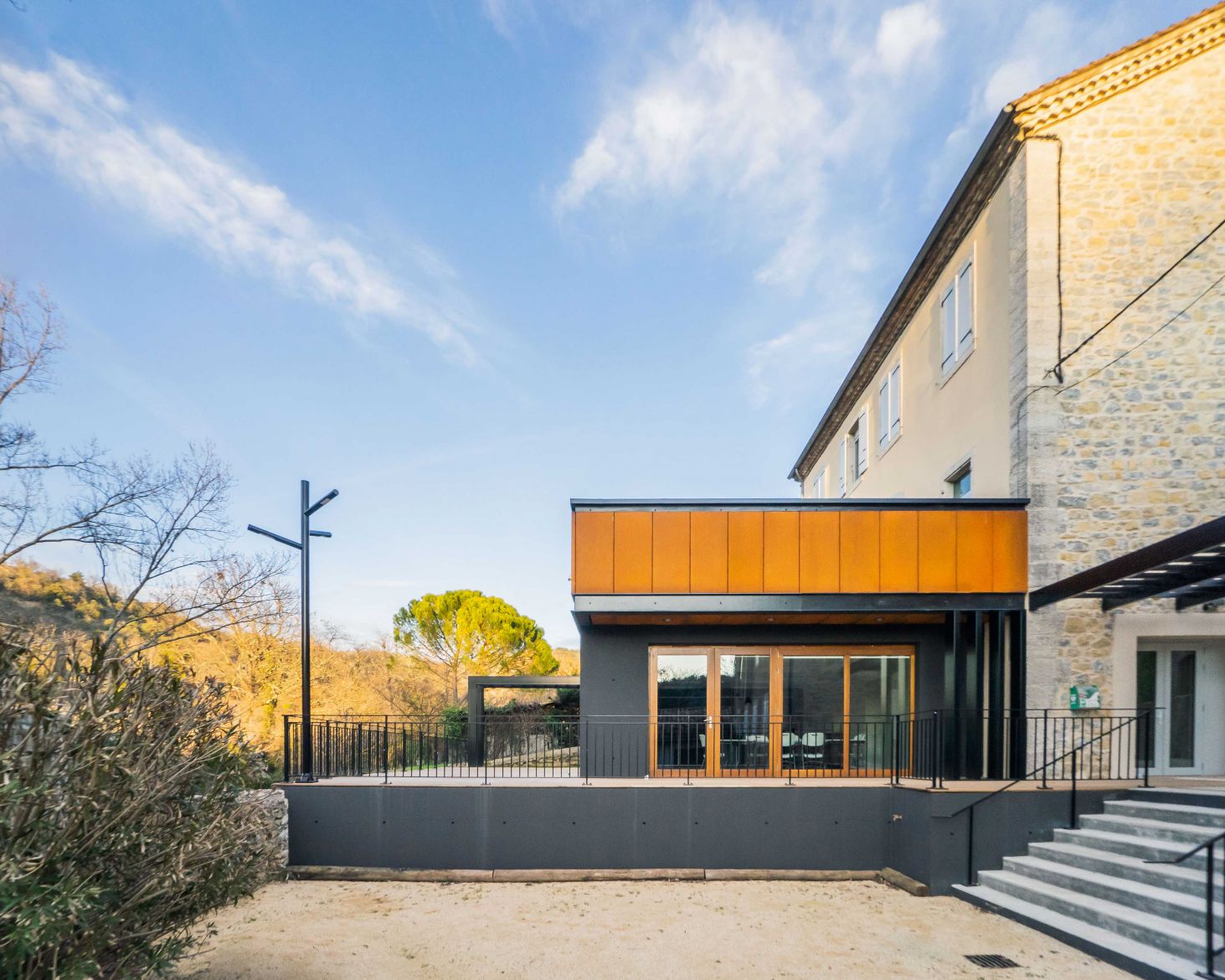 Le projet propose un extension simple sur le même niveau de la salle actuelle : en découvrant les lieux, c’est l’idée de composer avec l’existant, plutôt qu’un geste architectural, s’est immédiatement imposée. Ce qui nous a naturellement conduit à également réhabiliter la façade d’appui de l’extension en accord avec les prescriptions de l’AVAP et de l’ABF. Entre association de matières ( acier Corten, pierres de taille, bois massif et béton ) et jeux de niveaux, émerge l'extension, offrant des vues sur les vignes et les berges du ruisseau de Vendoule, ceci depuis la terrasse mais aussi des larges ouvertures façades ouest et nord de la salle.