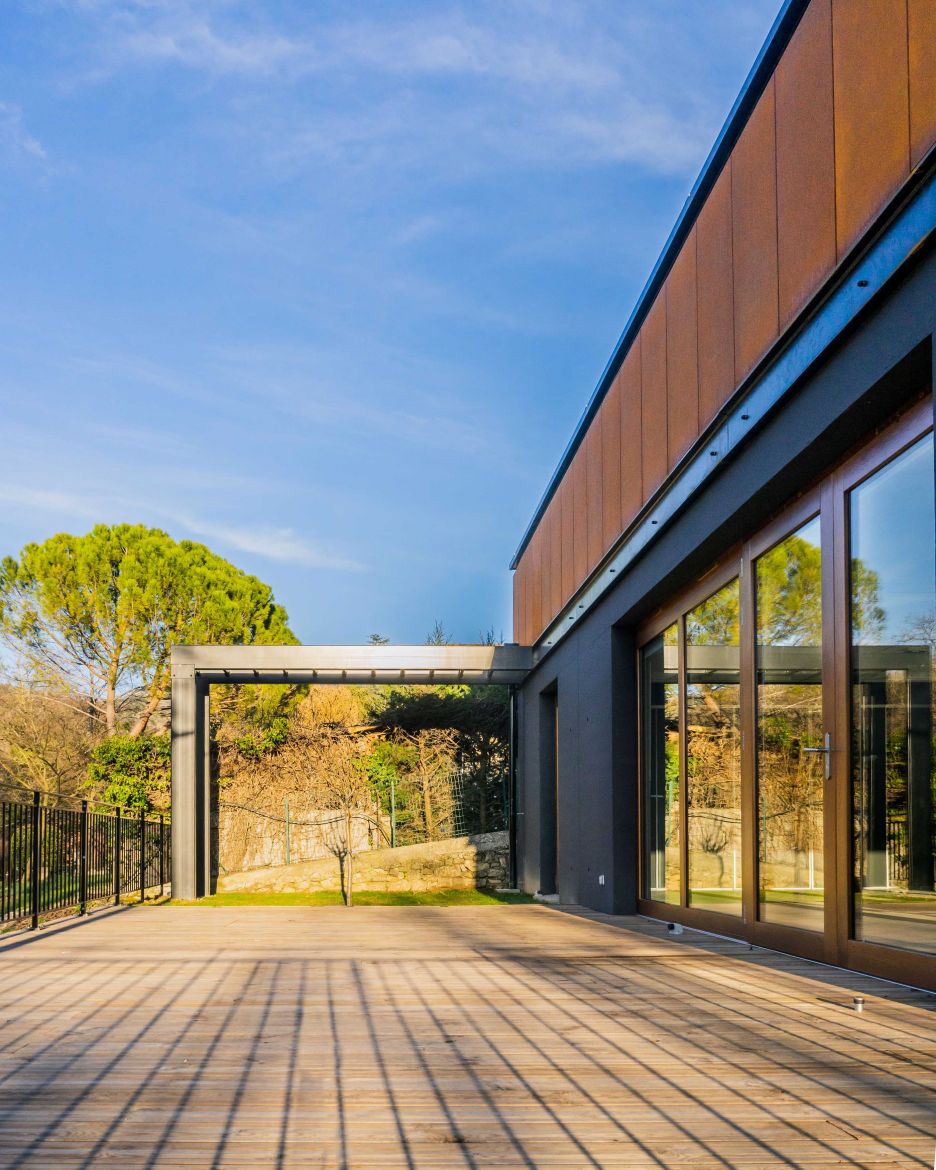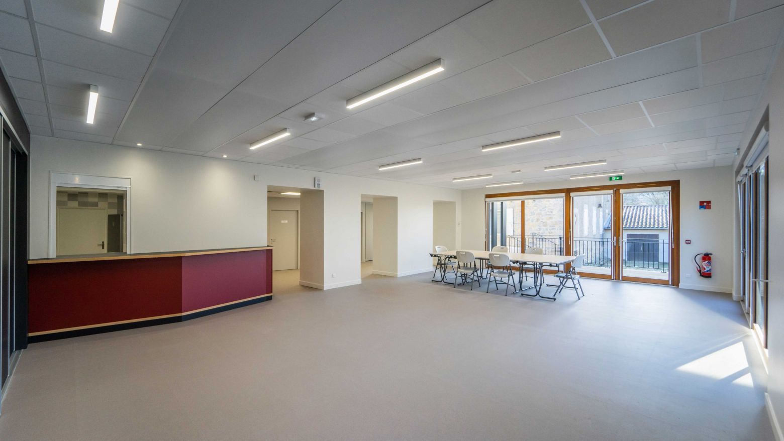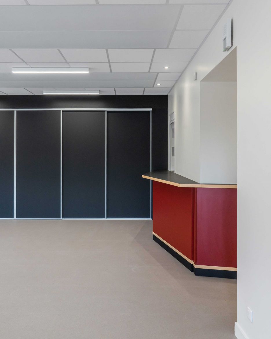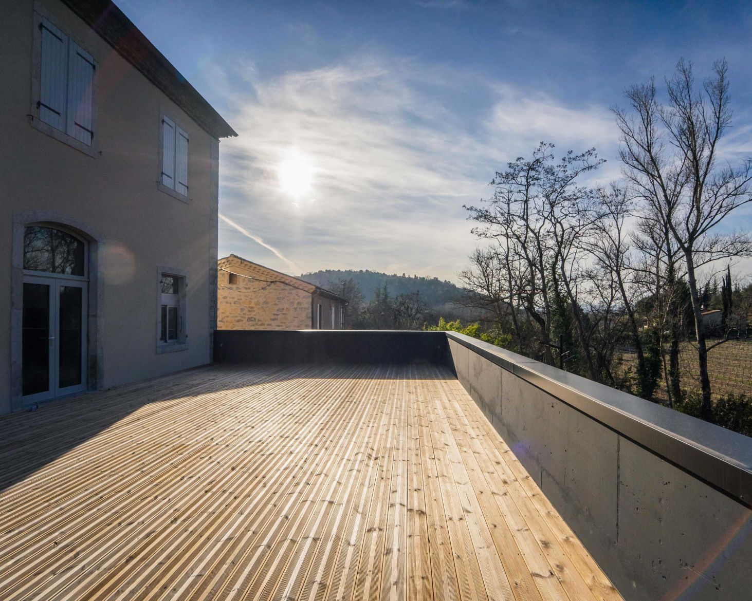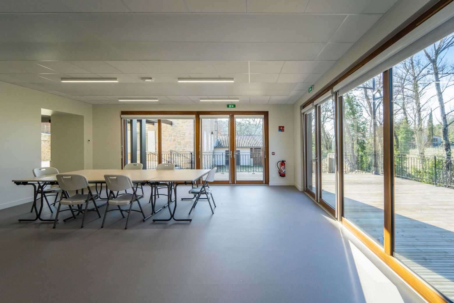 Le projet propose un extension simple sur le même niveau de la salle actuelle : en découvrant les lieux, c’est l’idée de composer avec l’existant, plutôt qu’un geste architectural, s’est immédiatement imposée. Ce qui nous a naturellement conduit à également réhabiliter la façade d’appui de l’extension en accord avec les prescriptions de l’AVAP et de l’ABF. Entre association de matières ( acier Corten, pierres de taille, bois massif et béton ) et jeux de niveaux, émerge l'extension, offrant des vues sur les vignes et les berges du ruisseau de Vendoule, ceci depuis la terrasse mais aussi des larges ouvertures façades ouest et nord de la salle.