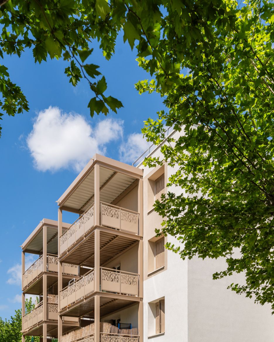 Inscrit dans un projet urbain global du quartier, l'opération vise à améliorer l'usage des logements : création des balcons, mise à distance des véhicules, rénovation thermique (DPE classe B). Les travaux comprennent : l'isolation par l'extérieur des façades, l'isolation et réféction de l'étanchéité de la toiture terrasse, l'isolation des sous faces dans les caves, la rénovation des menuiseries et occultations, la rénovation du système de ventilation collective, la rénovation des paries commues (halls d'entrées, portes d'accès aux caves), création des balcons, travaux de résidentialisation (accessibilité des immeubles, différentiation de l'espace public/privé, aménagement des espaces collectifs, rénovation de l'éclairage extérieur).