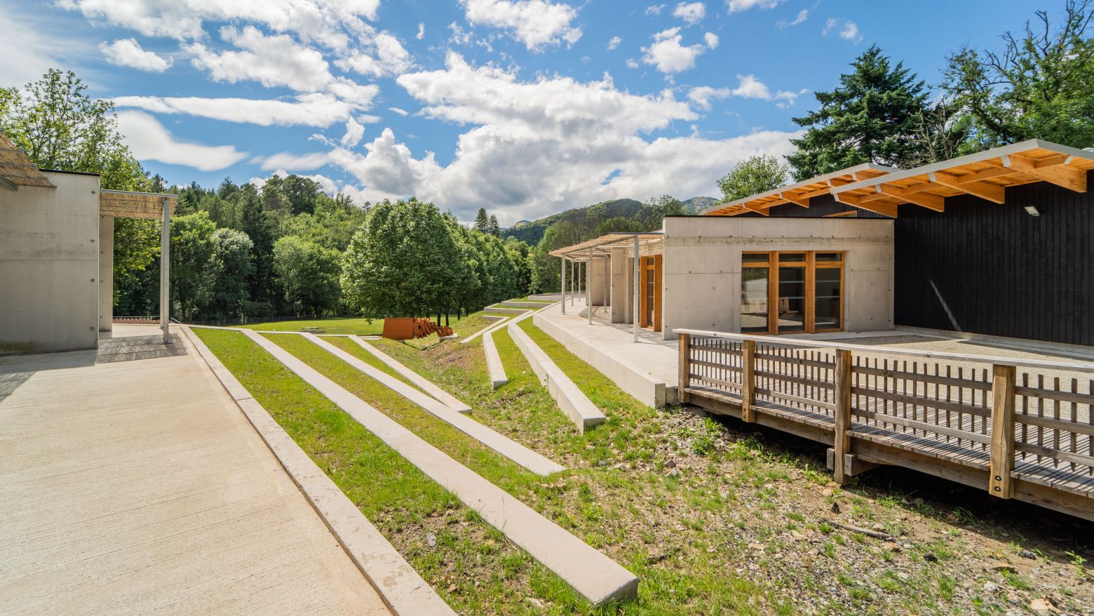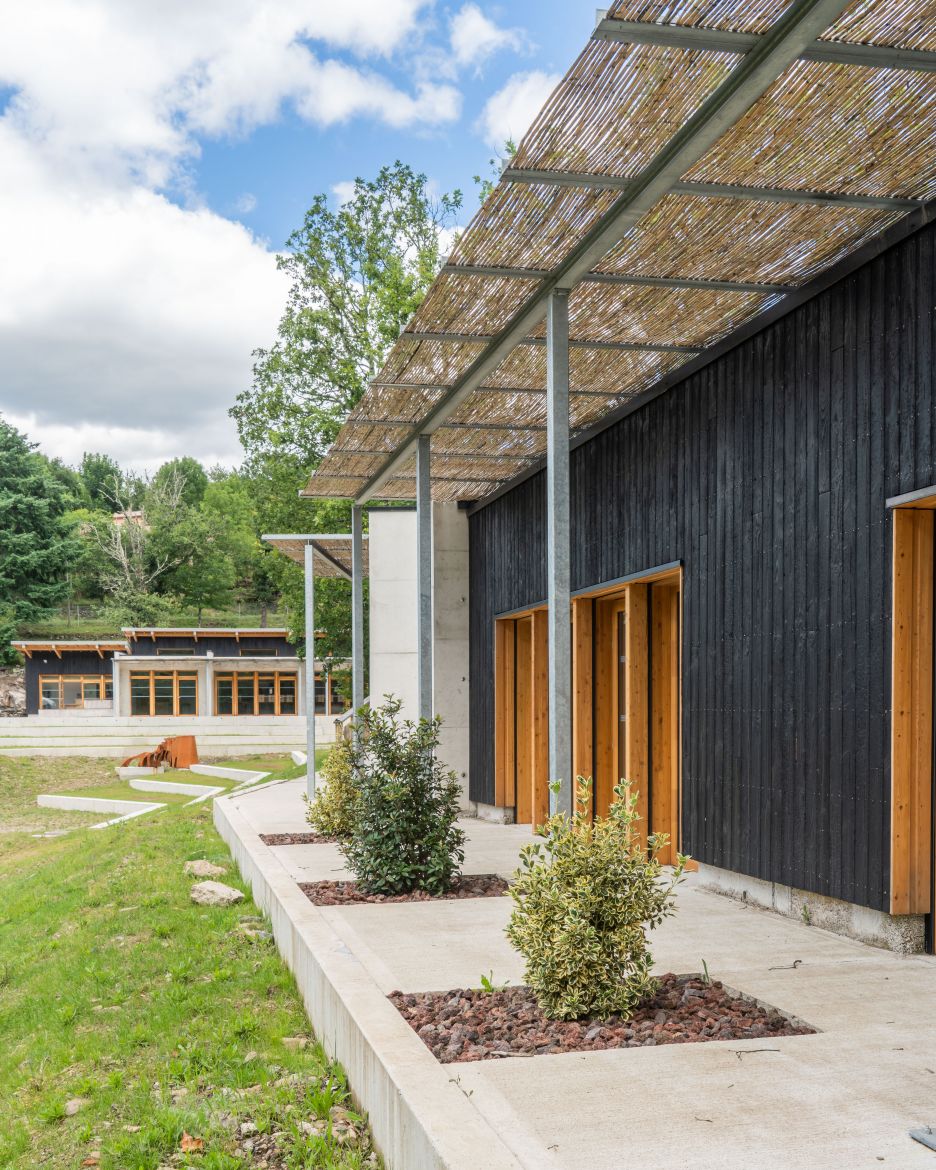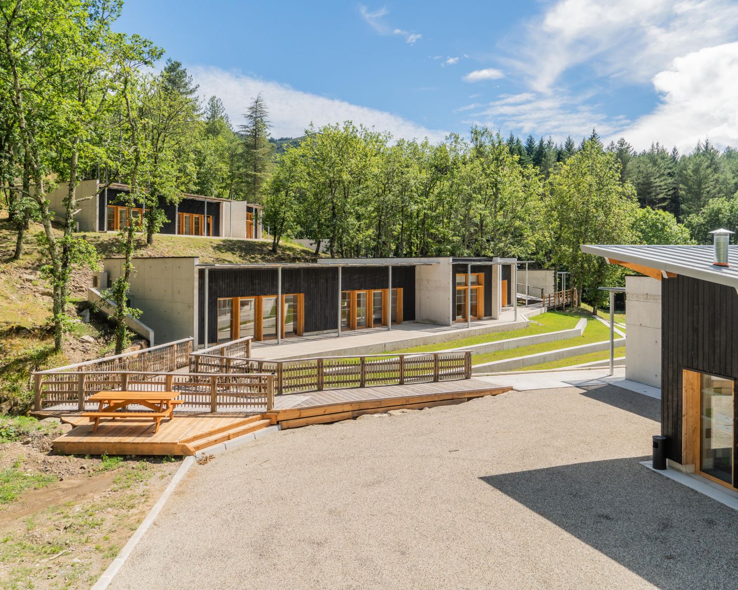 Nous répartissons les maisons dans la foret, une à la lisière, les autres sous les chênes. Le bâtiment d’accueil prend place sur la grande plateforme existante au bout de la voie d’accès, face au talweg que nous remodelons pour le mettre en scène. Les 5 unités, indépendantes les unes des autres, regardent vers le paysage, proche et lointain ; jouent des courbes de niveau, s’orientent dans le site en fonction de son ouverture et de sa hauteur. Les volumes s’encastrent dans la pente pour proposer une seule façade par maison, pour offrir aux utilisateurs une vue, différente à chaque fois. Le projet de paysage intervient comme support à la transformation du site. L’esquisse du projet s’inscrit dans la géographie, la géomorphologie et l’écosystème du lieu. D’abord à l’échelle du site : les anciennes traces d’occupation sont gommées afin de faire apparaître le talweg enfouis et dissimulé sous la dalle. Ensuite à l’échelle du territoire : le projet se tourne vers le grand paysage, vers les monts d’Abraham et du Midi. Particularités du projet Matériaux à faible impact environnemental Bardage en bois brulé Ombrelles en branches tressées issues des jeunes pousses du site Mobilier en bois issu des arbres coupés sur site, insallation d’une scierie mobile Organisation d’ateliers et de workshop avec des écoles de compagnonage, architecture, paysage, pour intervention sur site (chantier participatif)