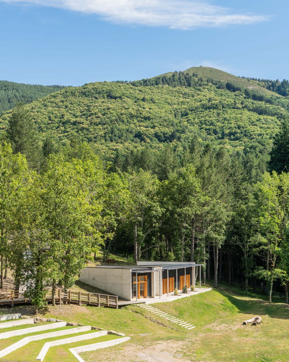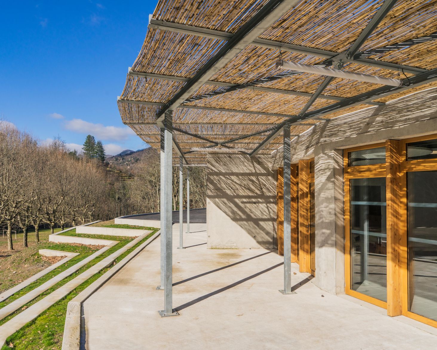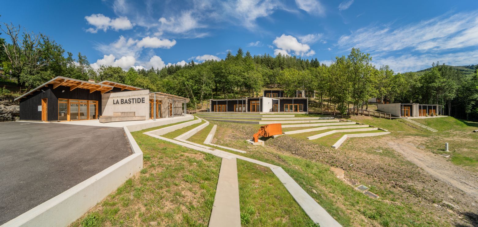 Nous répartissons les maisons dans la foret, une à la lisière, les autres sous les chênes. Le bâtiment d’accueil prend place sur la grande plateforme existante au bout de la voie d’accès, face au talweg que nous remodelons pour le mettre en scène. Les 5 unités, indépendantes les unes des autres, regardent vers le paysage, proche et lointain ; jouent des courbes de niveau, s’orientent dans le site en fonction de son ouverture et de sa hauteur. Les volumes s’encastrent dans la pente pour proposer une seule façade par maison, pour offrir aux utilisateurs une vue, différente à chaque fois. Le projet de paysage intervient comme support à la transformation du site. L’esquisse du projet s’inscrit dans la géographie, la géomorphologie et l’écosystème du lieu. D’abord à l’échelle du site : les anciennes traces d’occupation sont gommées afin de faire apparaître le talweg enfouis et dissimulé sous la dalle. Ensuite à l’échelle du territoire : le projet se tourne vers le grand paysage, vers les monts d’Abraham et du Midi. Particularités du projet Matériaux à faible impact environnemental Bardage en bois brulé Ombrelles en branches tressées issues des jeunes pousses du site Mobilier en bois issu des arbres coupés sur site, insallation d’une scierie mobile Organisation d’ateliers et de workshop avec des écoles de compagnonage, architecture, paysage, pour intervention sur site (chantier participatif)